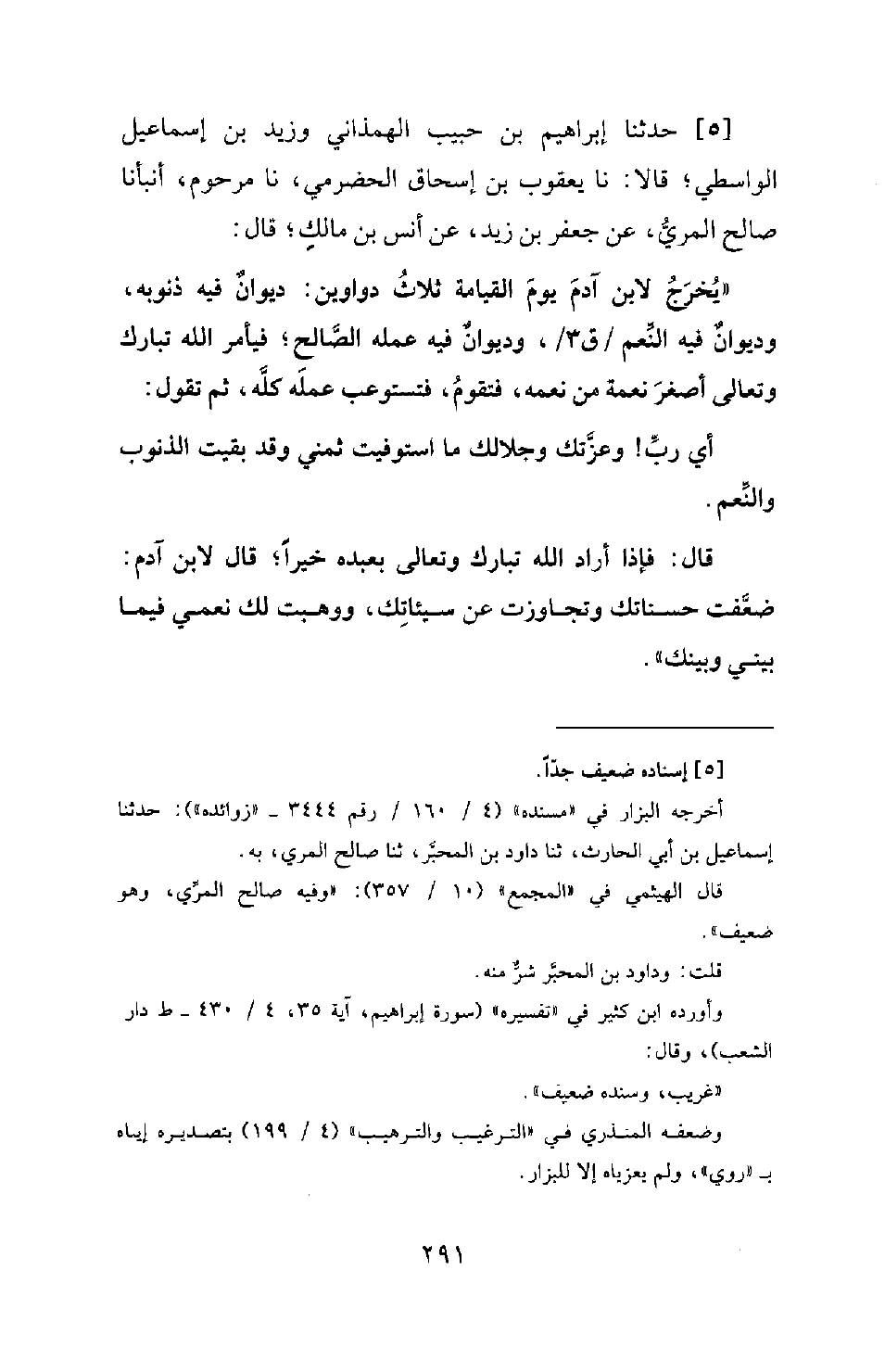 5 - حَدَّثَنَا إِبْرَاهِيمُ بن حبيب الهمداني وَزَيْدُ بْنُ إِسْمَاعِيلَ الْوَاسِطِيُّ؛ قَالَا: نَا يَعْقُوبُ بْنُ إِسْحَاقَ الْحَضْرَمِيُّ، نَا مَرْحُومٌ، أَنْبَأَنَا صَالِحٌ الْمُرِّيُّ، عَنْ جَعْفَرِ بْنِ زَيْدٍ، عَنْ أَنَسِ بْنِ مَالِكٍ؛ قَالَ: يُخْرَجُ لِابْنِ آدَمَ يَوْمَ الْقِيَامَةِ ثَلَاثُ دَوَاوِينَ: دِيوَانٌ فِيهِ ذُنُوبُهُ، وَدِيوَانٌ فِيهِ النِّعَمُ، وَدِيوَانٌ فِيهِ عَمَلُهُ الصَّالِحُ؛ فَيَأْمُرُ اللهُ تَبَارَكَ وَتَعَالَى أَصْغَرَ نِعْمَةٍ مِنْ نِعَمِهِ، فَتَقُومُ، فَتَسْتَوْعِبُ عَمَلَهُ كُلَّهُ، ثُمَّ تَقُولُ: أَيْ رَبِّ! وَعِزَّتِكَ وَجَلَالِكَ مَا اسْتَوْفَيْتُ ثَمَنِي، وَقَدْ بَقِيَتِ الذُّنُوبُ وَالنِّعَمُ. قَالَ: فَإِذَا أَرَادَ اللهُ تَبَارَكَ وَتَعَالَى بِعَبْدِهِ خَيْرًا؛ قَالَ لِابْنِ آدَمَ: ضَعَّفْتُ حَسَنَاتِكَ وَتَجَاوَزْتُ عَنْ سَيِّئَاتِكَ، وَوَهَبْتُ لَكَ نِعَمِي فِيمَا بَيْنِي وَبَيْنَكَ