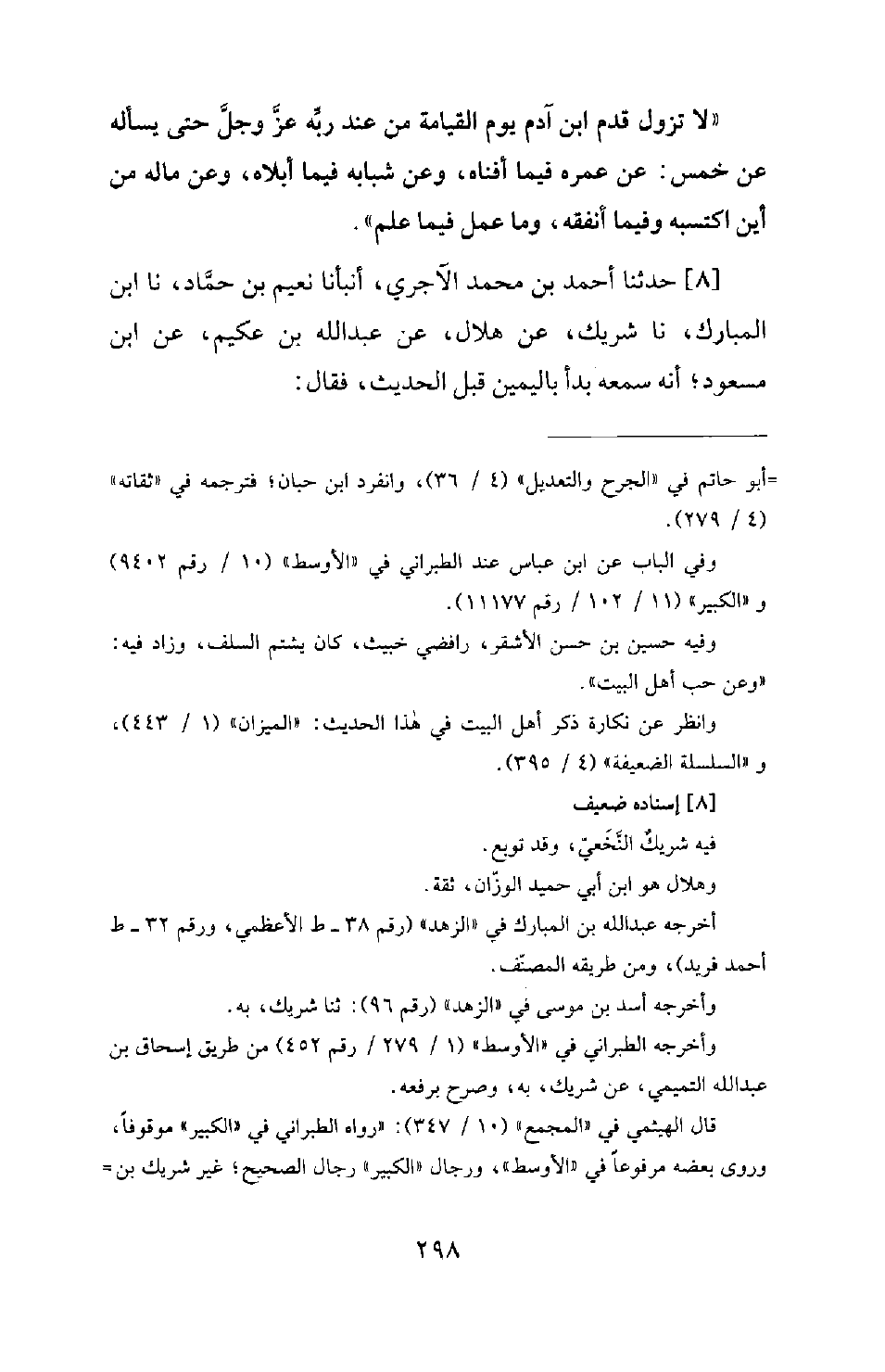 8 - حَدَّثَنَا أَحْمَدُ بْنُ مُحَمَّدٍ الْآجُرِّيُّ، أَنْبَأَنَا نُعَيْمُ بْنُ حَمَّادٍ، نَا ابْنُ الْمُبَارَكِ، نَا شَرِيكٌ، عَنْ هِلَالٍ، عَنْ عَبْدِ اللهِ بْنِ عُكَيْمٍ، عَنِ ابْنِ مَسْعُودٍ؛ أَنَّهُ سَمِعَهُ بَدَأَ بِالْيَمِينِ قَبْلَ الْحَدِيثِ، فَقَالَ: -[300]- وَاللهِ؛ مَا مِنْكُمْ مِنْ أَحَدٍ إِلَّا سيخلوا بِهِ رَبُّهُ عَزَّ وَجَلَّ كَمَا يَخْلُو أَحَدُكُمْ بِالْقَمَرِ لَيْلَةَ الْبَدْرِ، ثُمَّ يَقُولُ: ابْنَ آدَمَ! مَا غَرَّكَ بِي؟ مَاذَا عَمِلْتَ فِيمَا عَلِمْتَ؟ ابْنَ آدَمَ! مَاذَا أَجَبْتَ الْمُرْسَلِينَ؟