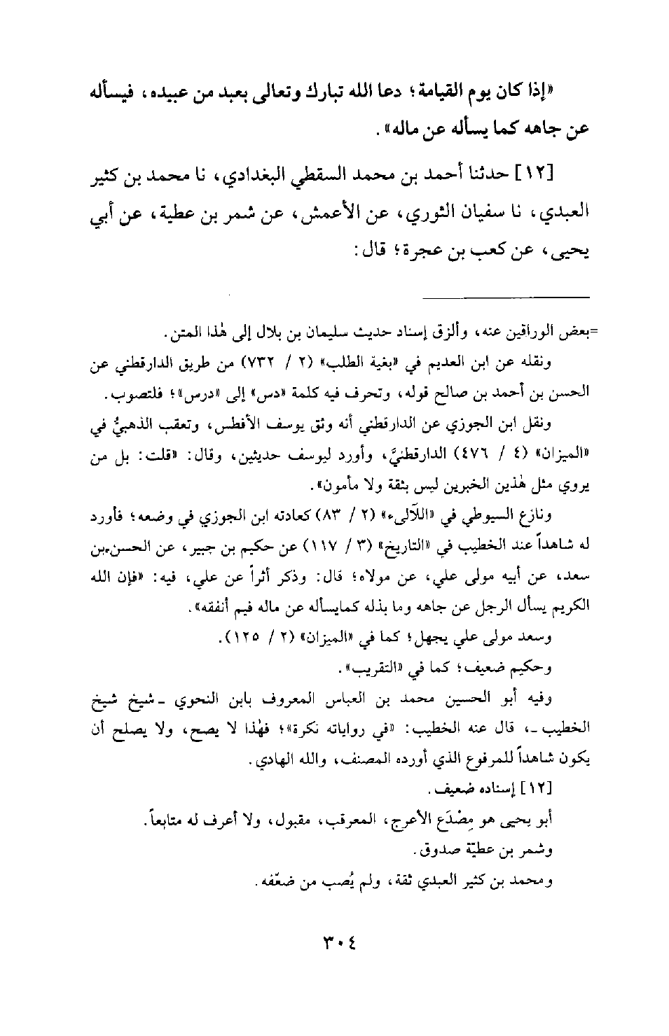 12 - حَدَّثَنَا أَحْمَدُ بْنُ مُحَمَّدٍ السَّقَطِيُّ الْبَغْدَادِيُّ، نَا مُحَمَّدُ بْنُ كَثِيرٍ الْعَبْدِيُّ، نَا سُفْيَانُ الثَّوْرِيُّ، عَنِ الْأَعْمَشِ، عَنْ شِمْرِ بْنِ عَطِيَّةَ، عَنْ أَبِي يَحْيَى، عَنْ كَعْبِ بْنِ عَجْرَةَ؛ قَالَ: -[305]- يُؤْتَى بِرَجُلٍ يَوْمَ الْقِيَامَةِ، فَيُوزَنُ بِحَبَّةِ حِنْطَةٍ؛ فَلَا يَزِنُ، ثُمَّ يُوزَنُ بِجَنَاحِ بَعُوضَةٍ؛ فَلَا يَزِنُ، ثُمَّ قَرَأَ: {أُولَئِكَ الَّذِينَ كَفَرُوا بِآيَاتِ رَبِّهِمْ وَلِقَائِهِ فَحَبِطَتْ أَعْمَالُهُمْ فَلا نُقِيمُ لَهُمْ يَوْمَ الْقِيَامَةِ وزنا} [الكهف: 105]