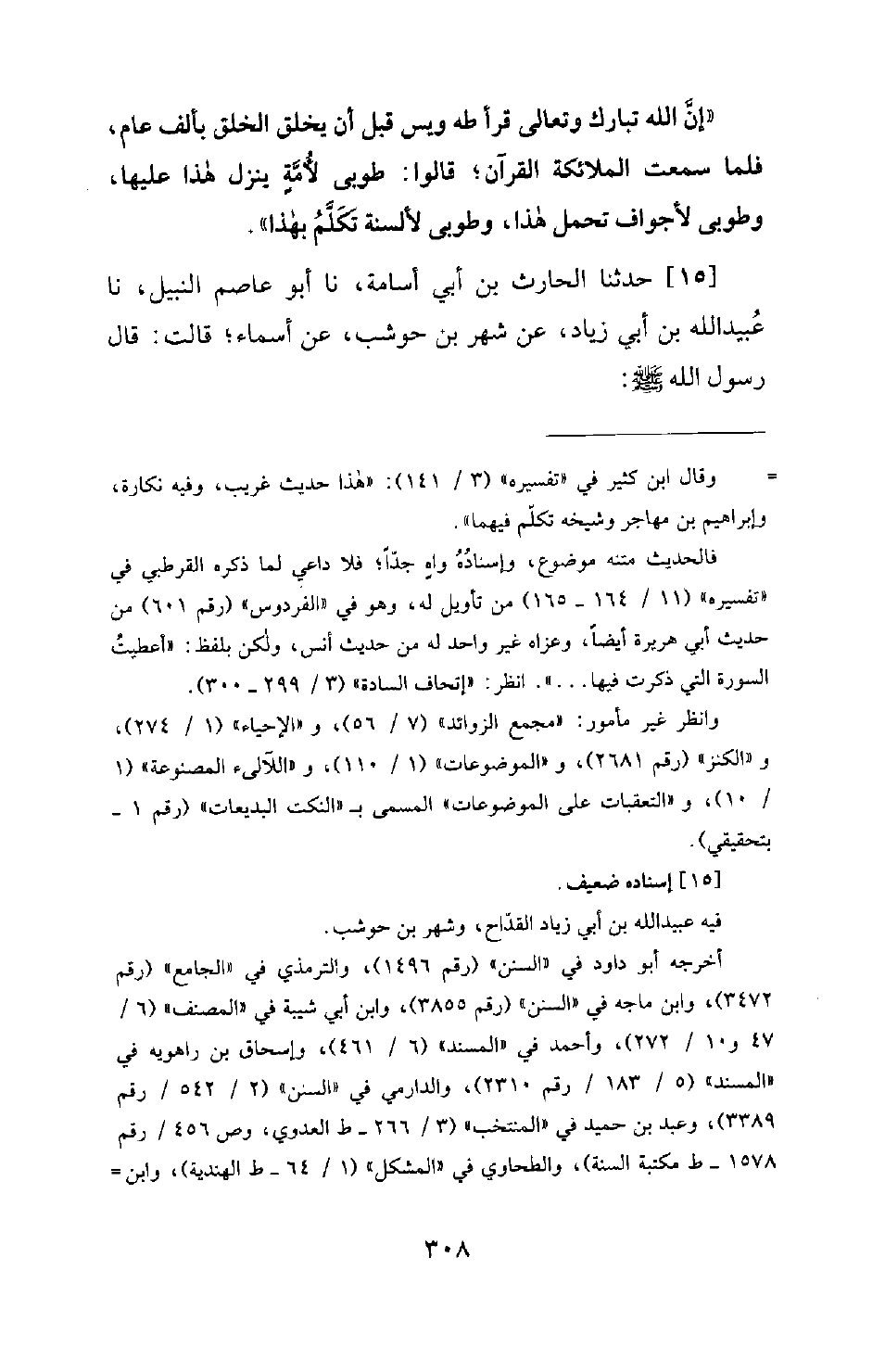 15 - حَدَّثَنَا الْحَارِثُ بْنُ أَبِي أُسَامَةَ، نَا أَبُو عَاصِمٍ النَّبِيلُ، نَا عُبَيْدُ اللهِ بْنُ أَبِي زِيَادٍ، عَنْ شَهْرِ بْنِ حَوْشَبٍ، عَنْ أَسْمَاءَ؛ قَالَتْ: قَالَ رَسُولُ اللهِ -[309]- صَلَّى اللَّهُ عَلَيْهِ وَسَلَّمَ: «اسْمُ اللهِ عَزَّ وَجَلَّ الْأَعْظَمُ فِي هَاتَيْنِ الْآيَتَيْنِ: {اللهُ لا إِلَهَ إِلا هُوَ الْحَيُّ الْقَيُّومُ} [البقرة: 255] ، {وَإِلَهُكُمْ إِلَهٌ وَاحِدٌ} [البقرة: 163] »