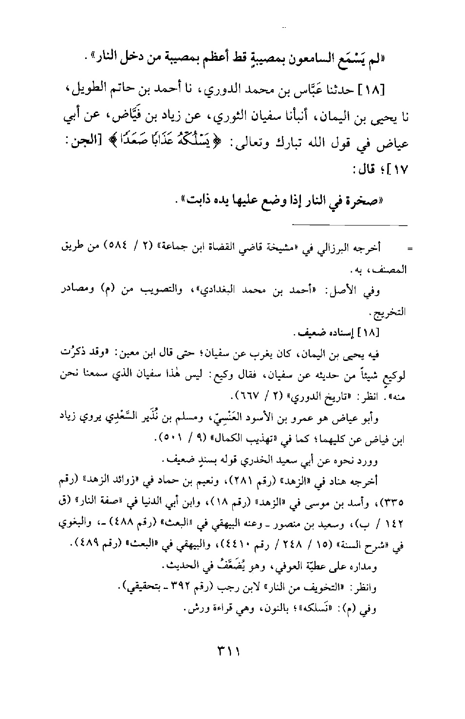 18 - حَدَّثَنَا عَبَّاسُ بْنُ مُحَمَّدٍ الدُّورِيُّ، نَا أَحْمَدُ بْنُ حَاتِمٍ الطَّوِيلُ، نَا يَحْيَى بْنُ الْيَمَانِ، أَنْبَأَنَا سُفْيَانُ الثَّوْرِيُّ، عَنْ زِيَادِ بْنِ فَيَّاضٍ، عَنْ أَبِي عِيَاضٍ فِي قَوْلِ اللهِ تَبَارَكَ وَتَعَالَى: {يسلكه عذابا صعدا} [الجن: 17] ؛ قال: صَخْرَةٌ فِي النَّارِ إِذَا وَضَعَ عَلَيْهَا يَدَهُ ذَابَتْ