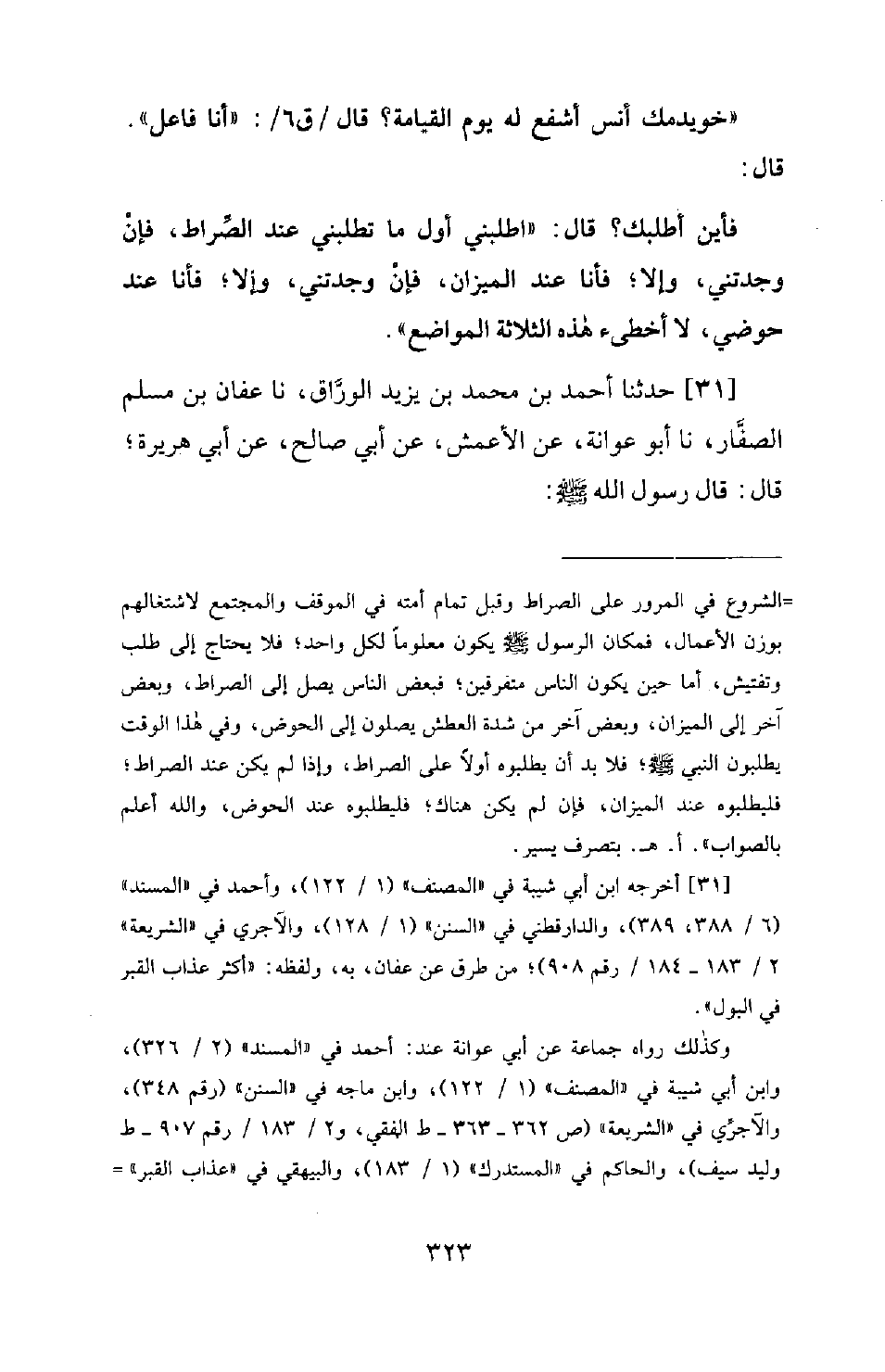 31 - حَدَّثَنَا أَحْمَدُ بْنُ مُحَمَّدِ بْنِ يَزِيدَ الْوَرَّاقُ، نَا عَفَّانُ بْنُ مُسْلِمٍ الصَّفَّارُ، نَا أَبُو عَوَانَةَ، عَنِ الْأَعْمَشِ، عَنْ أَبِي صَالِحٍ، عَنْ أَبِي هُرَيْرَةَ؛ قَالَ: قَالَ رَسُولُ اللهِ -[324]- صَلَّى اللَّهُ عَلَيْهِ وَسَلَّمَ: «تَنَزَّهُوا مِنَ الْبَوْلِ؛ فَإِنَّ عَامَّةَ عَذَابِ الْقَبْرِ مِنَ الْبَوْلِ»