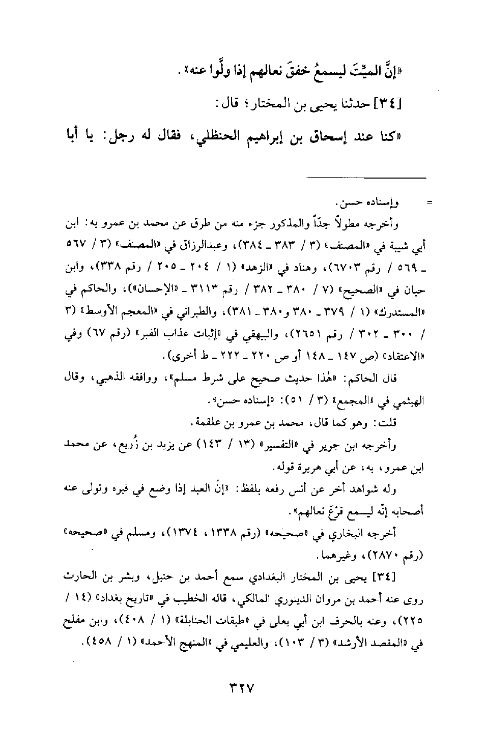 34 - حَدَّثَنَا يَحْيَى بْنُ الْمُخْتَارِ؛ قَالَ: كُنَّا عِنْدَ إِسْحَاقَ بْنِ إِبْرَاهِيمَ الْحَنْظَلِيِّ، فَقَالَ لَهُ رَجُلٌ: يَا أَبَا -[328]- يَعْقُوبَ! إِنَّ عِنْدَنَا ها هنا قَوْمًا لَا يُؤْمِنُونَ بِمُنْكَرٍ وَنَكِيرٍ. فَقَالَ لَهُ إِسْحَاقُ: سيردون فيعملون.