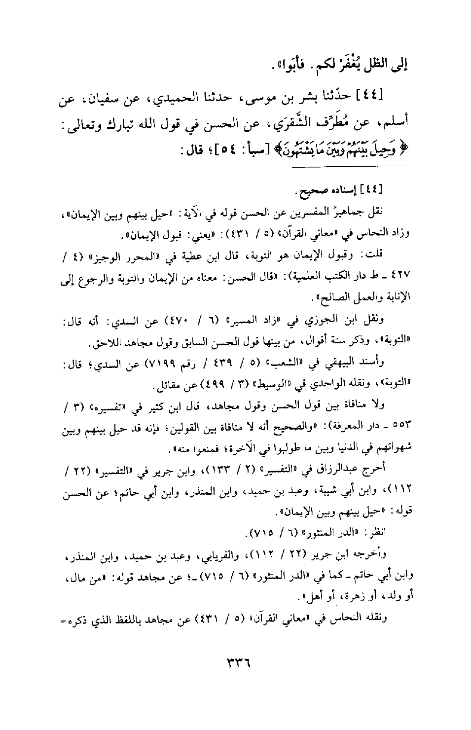44 - حَدَّثَنَا بِشْرُ بْنُ مُوسَى، حَدَّثَنَا الْحُمَيْدِيُّ، عَنْ سُفْيَانَ، عَنْ أَسْلَمَ، عَنْ مُطَرِّفٍ الشَّقَرِيِّ، عَنِ الْحَسَنِ فِي قَوْلِ اللهِ تَبَارَكَ وَتَعَالَى: {وَحِيلَ بَيْنَهُمْ وَبَيْنَ مَا يَشْتَهُونَ} [سبأ: 54] ؛ قَالَ: -[337]- هِيَ التَّوْبَةُ. قَالَ سُفْيَانُ: وَفِي تَفْسِيرِ مُجَاهِدٍ: زهرة الحياة ولذاتها