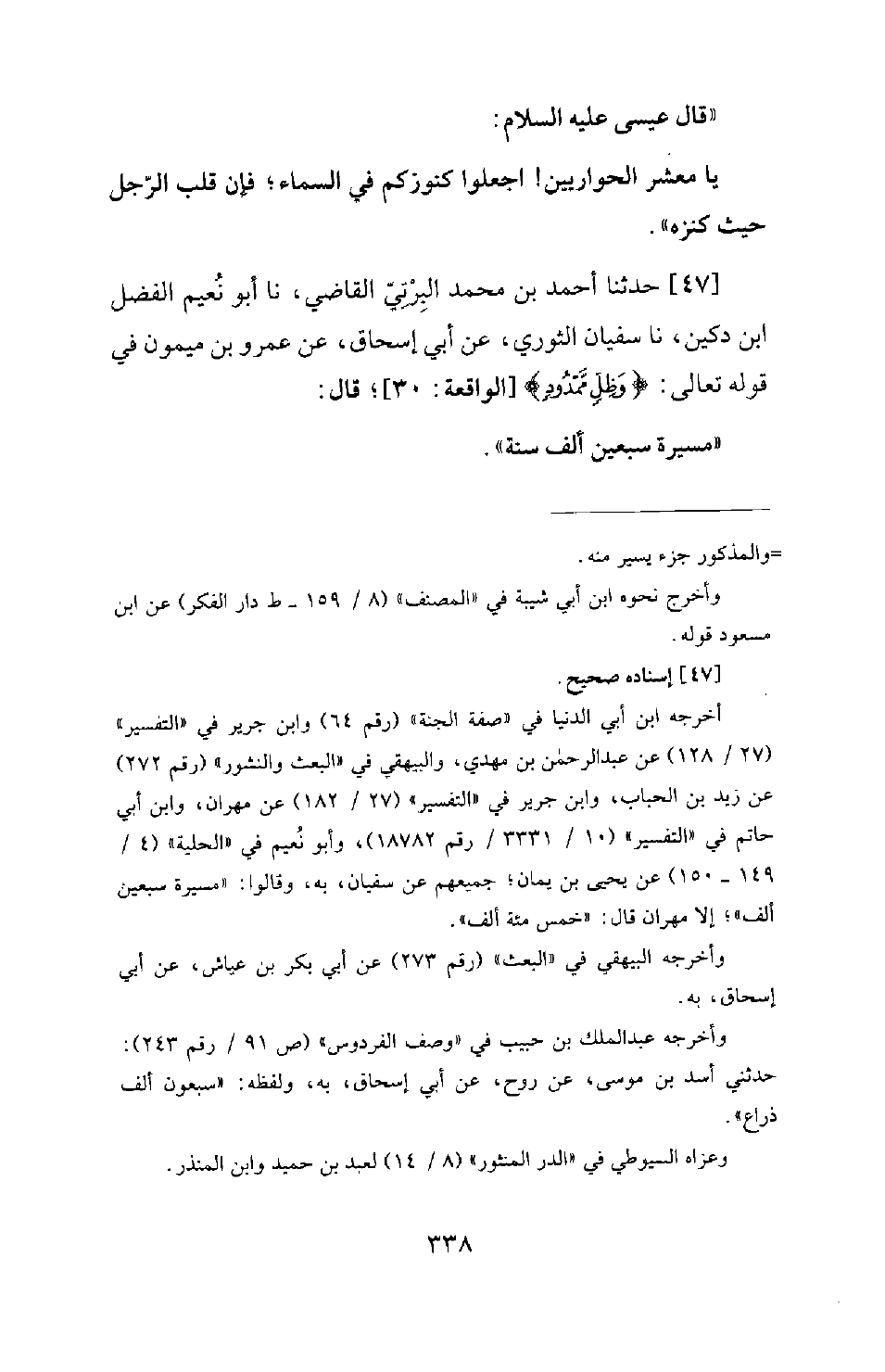 47 - حَدَّثَنَا أَحْمَدُ بْنُ مُحَمَّدٍ الْبِرْتِيُّ الْقَاضِي، نَا أَبُو نُعَيْمٍ الْفَضْلُ بْنُ دُكَيْنٍ، نَا سُفْيَانُ الثَّوْرِيُّ، عَنْ أَبِي إِسْحَاقَ، عَنْ عَمْرِو بْنِ مَيْمُونٍ فِي قَوْلِهِ تَعَالَى: {وظل ممدود} [الواقعة: 40] ؛ قَالَ: مَسِيرَةُ سَبْعِينَ أَلْفَ سَنَةٍ