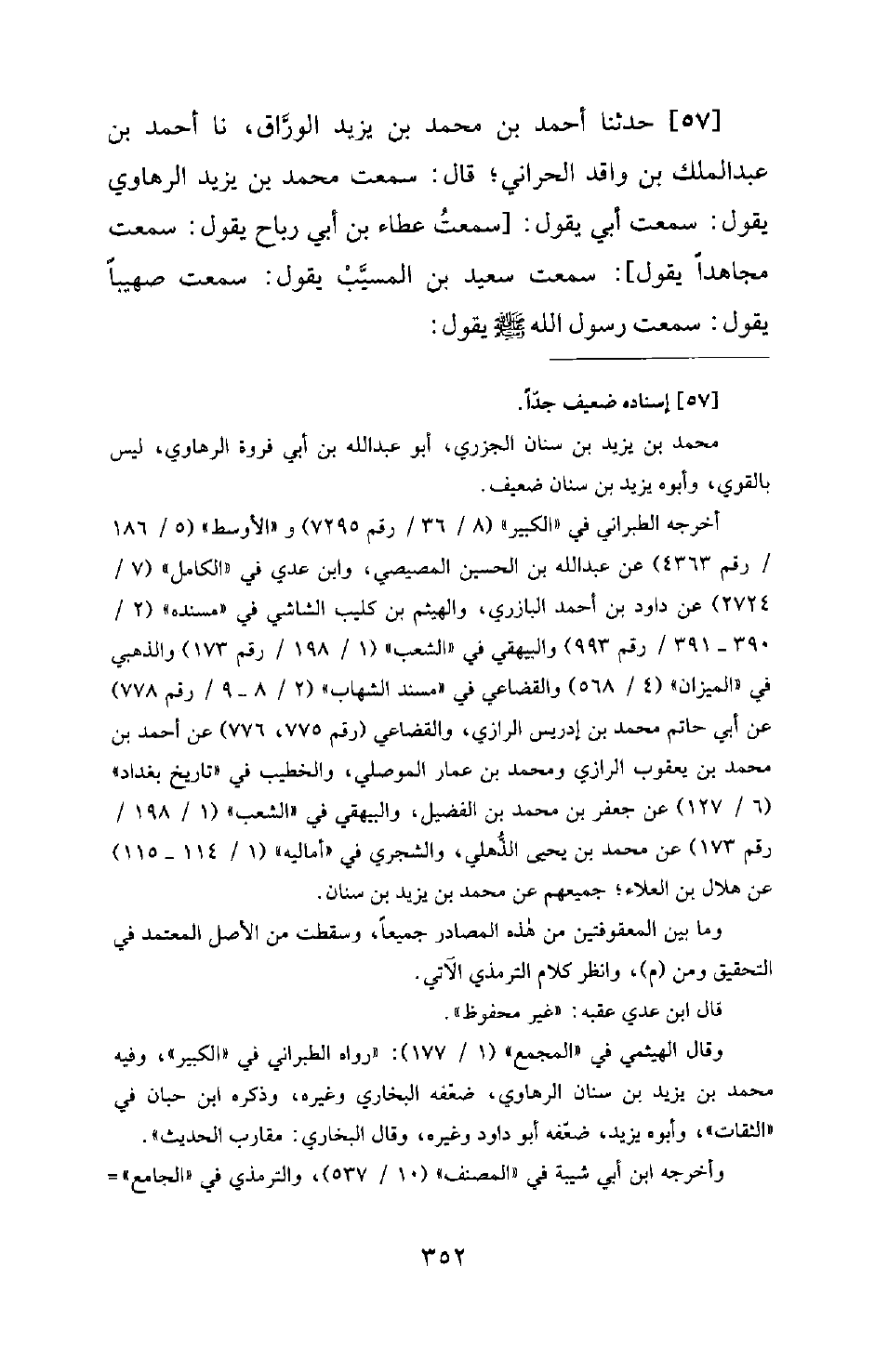 57 - حَدَّثَنَا أَحْمَدُ بْنُ مُحَمَّدِ بْنِ يَزِيدَ الْوَرَّاقُ، نَا أَحْمَدُ بْنُ عَبْدِ الْمَلِكِ بْنِ وَاقِدٍ الْحَرَّانِيُّ؛ قَالَ: سَمِعْتُ مُحَمَّدَ بْنَ يَزِيدَ الرَّهَاوِيَّ يَقُولُ: سَمِعْتُ أَبِي يَقُولُ: [سَمِعْتُ عَطَاءَ بْنَ أَبِي رَبَاحٍ يَقُولُ: سَمِعْتُ مُجَاهِدًا يَقُولُ] : سَمِعْتُ سَعِيدَ بْنَ الْمُسَيِّبِ يَقُولُ: سَمِعْتُ صُهَيْبًا يَقُولُ: سَمِعْتُ رَسُولَ اللهِ صَلَّى اللَّهُ عَلَيْهِ وَسَلَّمَ يقول -[354]-: «مَا آمَنَ بِالْقُرْآنِ مَنِ اسْتَحَلَّ مَحَارِمَهُ»