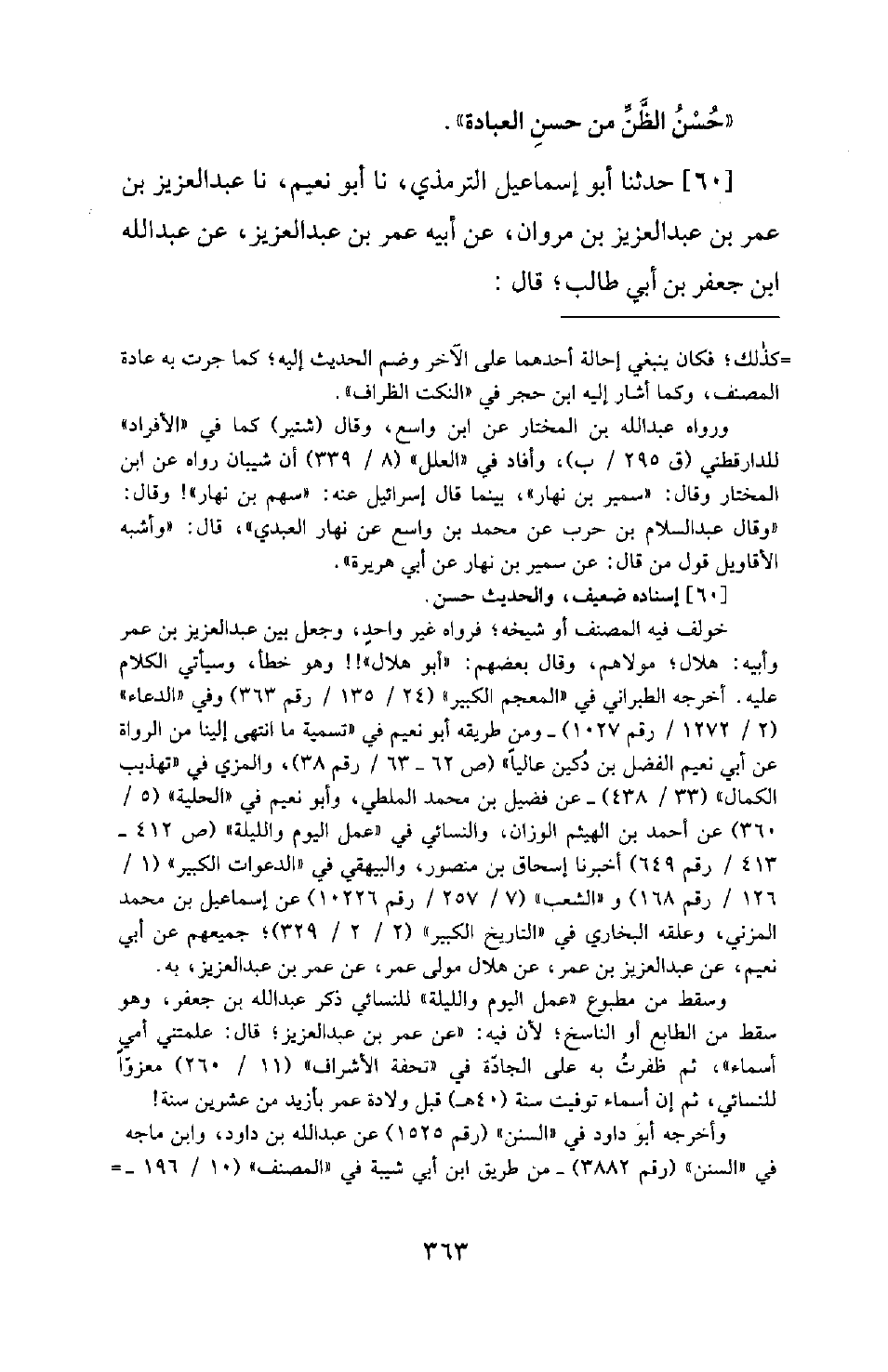 60 - حَدَّثَنَا أَبُو إِسْمَاعِيلَ التِّرْمِذِيُّ، نَا أَبُو نُعَيْمٍ، نَا عَبْدُ الْعَزِيزِ بْنُ عُمَرَ بْنِ عَبْدِ الْعَزِيزِ بْنِ مَرْوَانَ، عَنْ أَبِيهِ عُمَرَ بْنِ عَبْدِ الْعَزِيزِ، عَنْ عَبْدِ اللهِ بْنِ جَعْفَرِ بْنِ أَبِي طَالِبٍ؛ قَالَ: -[367]- عَلَّمَتْنِي أُمِّي أَسْمَاءُ بِنْتُ عُمَيْسٍ شَيْئًا أَمَرَهَا رَسُولُ اللهِ صَلَّى اللَّهُ عَلَيْهِ وَسَلَّمَ أَنْ تَقُولَهُ عِنْدَ الْكَرْبِ: «اللهُ اللهُ رَبِّي لَا أُشْرِكُ بِهِ شَيْئًا»