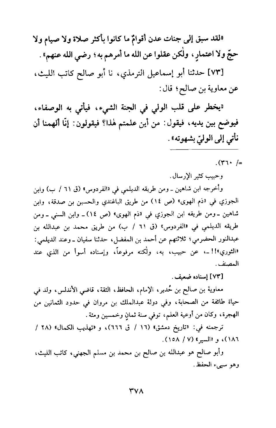 73 - حَدَّثَنَا أَبُو إِسْمَاعِيلَ التِّرْمِذِيُّ، نَا أَبُو صَالِحٍ كَاتِبُ اللَّيْثِ، عَنْ مُعَاوِيَةَ بْنِ صَالِحٍ؛ قَالَ: يَخْطُرُ عَلَى قَلْبِ الْوَلِيِّ فِي الْجَنَّةِ الشَّيْءَ، فَيَأْتِي بِهِ الْوُصَفَاءُ، فَيُوضَعُ بَيْنَ يَدَيْهِ، فَيَقُولُ: مِنْ أَيْنَ عَلِمْتُمْ هَذَا؟ فَيَقُولُونَ: إِنَّا أُلْهِمْنَا أَنْ نَأْتِيَ إِلَى الْوَلِيِّ بِشَهْوَتِهِ