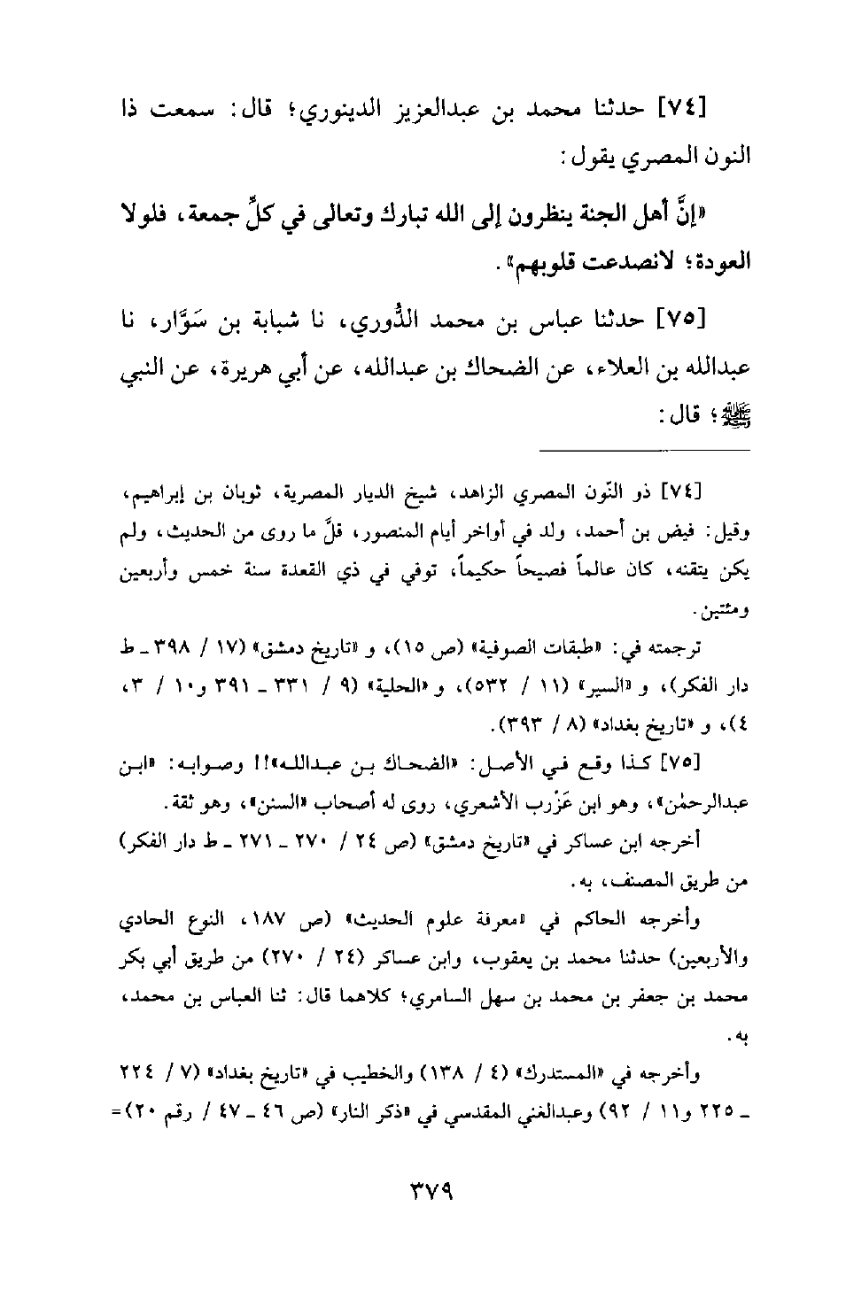 74 - حَدَّثَنَا مُحَمَّدُ بْنُ عَبْدِ الْعَزِيزِ الدَّيْنَوَرِيُّ؛ قَالَ: سَمِعْتُ ذَا النُّونِ الْمِصْرِيَّ يَقُولُ: إِنَّ أَهْلَ الْجَنَّةِ يَنْظُرُونَ إِلَى اللهِ تَبَارَكَ وَتَعَالَى فِي كُلِّ جُمُعَةٍ، فَلَوْلَا الْعَوْدَةُ؛ لَانْصَدَعَتْ قُلُوبُهُمْ.