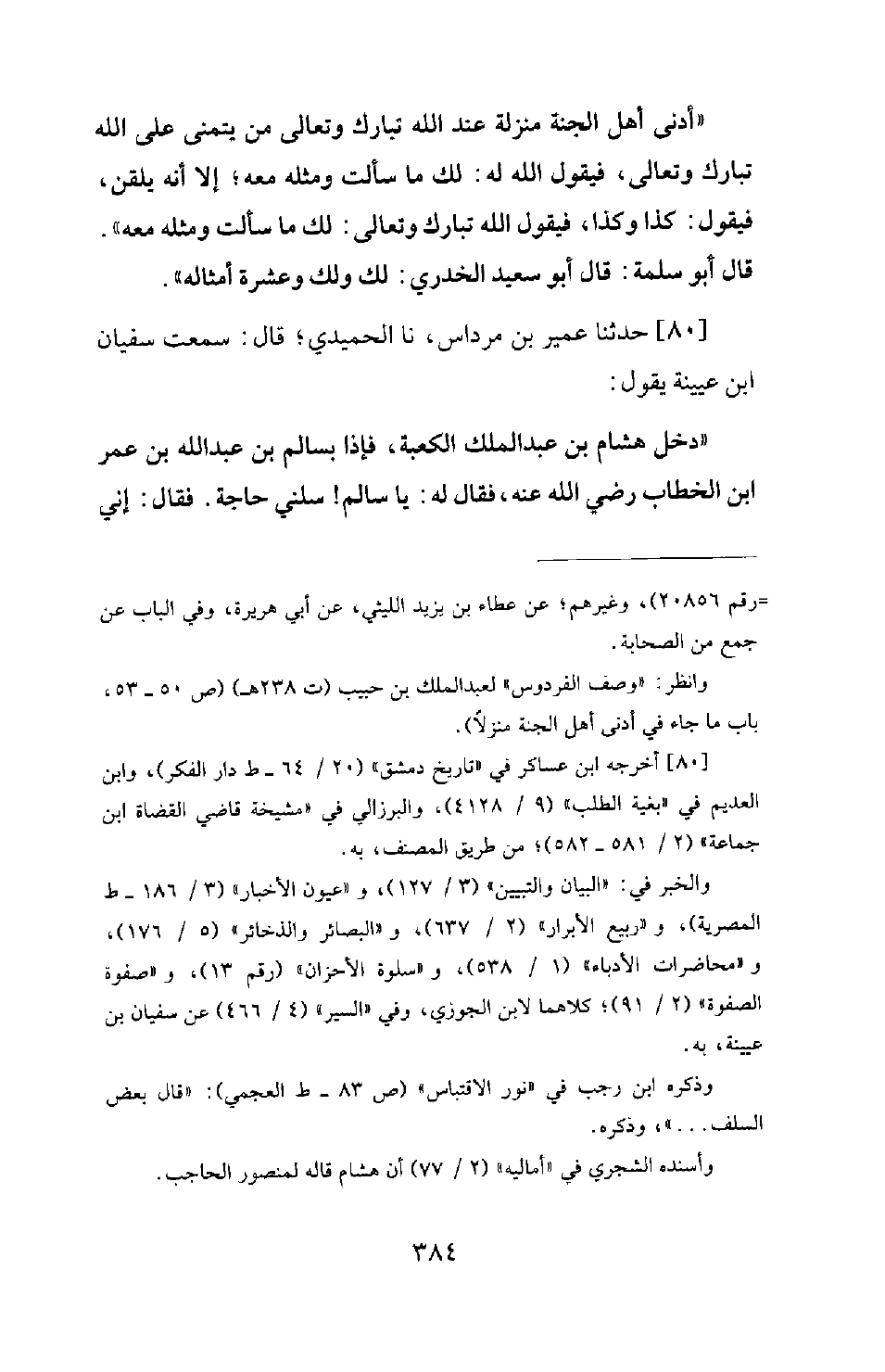80 - حَدَّثَنَا عُمَيْرُ بْنُ مِرْدَاسٍ، نَا الْحُمَيْدِيُّ، قَالَ: سَمِعْتُ سُفْيَانَ بْنَ عُيَيْنَةَ يَقُولُ: دَخَلَ هِشَامُ بْنُ عَبْدِ الْمَلِكِ الْكَعْبَةَ، فَإِذَا بِسَالِمِ بْنِ عَبْدِ اللهِ بْنِ عُمَرَ بْنِ الْخَطَّابِ رَضِيَ اللهُ عَنْهُ، فَقَالَ لَهُ: يَا سَالِمُ! سَلْنِي حَاجَةً. فَقَالَ: إِنِّي -[385]- أَسْتَحْيِي مِنَ اللهِ تَبَارَكَ وَتَعَالَى أَنْ أَسْأَلَ فِي بَيْتِ اللهِ غَيْرَ اللهِ. فَلَمَّا خَرَجَ خَرَجَ فِي إِثْرِهِ، فَقَالَ لَهُ: الْآنَ قَدْ خَرَجْتَ، فَسَلْنِي حَاجَةً؟ فَقَالَ لَهُ سَالِمٌ: مِنْ حَوَائِجِ الدُّنْيَا أَمْ مِنْ حَوَائِجِ الْآخِرَةِ؟ فَقَالَ: مِنْ حَوَائِجِ الدُّنْيَا. فَقَالَ لَهُ سَالِمٌ: أَمَا وَاللهِ مَا سَأَلْتُ الدُّنْيَا مَنْ يَمْلِكُهَا؛ فَكَيْفَ أَسْأَلُ الدُّنْيَا مَنْ لَا يَمْلِكُهَا؟ !