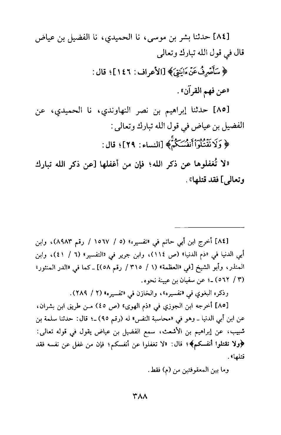 85 - حَدَّثَنَا إِبْرَاهِيمُ بْنُ نَصْرٍ النَّهَاوَنْدِيُّ، نا الحميدي، عن الفضل بْنِ عِيَاضٍ فِي قَوْلِ اللهِ تَبَارَكَ وَتَعَالَى: {وَلا تقتلوا أنفسكم} [النساء: 29] ؛ قَالَ: لَا تُغْفِلُوهَا عَنْ ذِكْرِ اللهِ؛ فَإِنَّ مَنْ أَغْفَلَهَا عَنْ ذِكْرِ اللهِ تَبَارَكَ وَتَعَالَى فَقَدْ قَتَلَهَا.