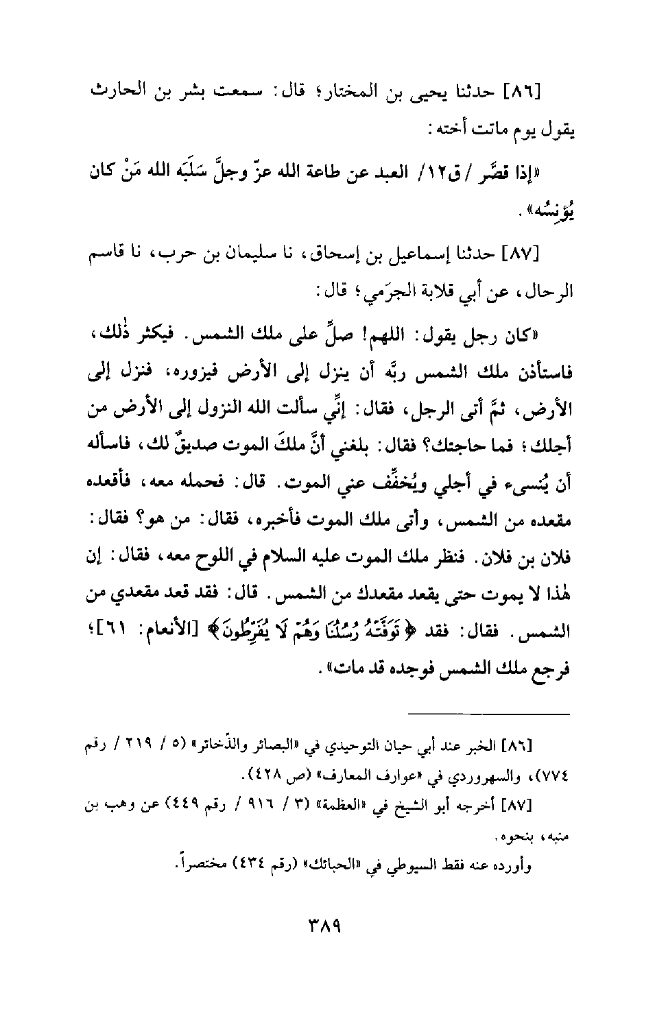 87 - حَدَّثَنَا إِسْمَاعِيلُ بْنُ إِسْحَاقَ، نَا سُلَيْمَانُ بْنُ حَرْبٍ، نَا قَاسِمٌ الرَّحَّالُ، عَنْ أَبِي قِلَابَةَ الْجَرْمِيِّ؛ قَالَ: كَانَ رَجُلٌ يَقُولُ: اللهُمَّ صَلِّ عَلَى مَلَكِ الشَّمْسِ. فَيُكْثِرُ ذَلِكَ، فَاسْتَأْذَنَ مَلَكُ الشَّمْسِ رَبَّهُ أَنْ يَنْزِلَ إِلَى الْأَرْضِ فَيَزُورَهُ، فَنَزَلَ إِلَى الْأَرْضِ، ثُمَّ أَتَى الرَّجُلَ، فَقَالَ: إِنِّي سَأَلْتُ اللهَ النُّزُولَ إِلَى الْأَرْضِ مِنْ أَجْلِكَ؛ فَمَا حَاجَتُكَ؟ فَقَالَ: بَلَغَنِي أَنَّ مَلَكَ الْمَوْتِ صَدِيقٌ لَكَ، فَاسْأَلْهُ أَنْ يُنْسِئَ فِي أَجَلِي وَيُخَفِّفَ عَنِّي الْمَوْتَ. قَالَ: فَحَمَلَهُ مَعَهُ، فَأَقْعَدَهُ مَقْعَدَهُ مِنَ الشَّمْسِ، وَأَتَى مَلَكَ الْمَوْتِ فَأَخْبَرَهُ، فَقَالَ: مَنْ هُوَ؟ فَقَالَ: فُلَانُ بْنُ فُلَانٍ. فَنَظَرَ مَلَكُ الْمَوْتِ عَلَيْهِ السَّلَامُ فِي اللَّوْحِ مَعَهُ، فَقَالَ: إِنَّ هَذَا لَا يَمُوتُ حَتَّى يَقْعُدَ مَقْعَدَكَ مِنَ الشَّمْسِ. قَالَ: فَقَدْ قَعَدَ مَقْعَدِي مِنَ الشَّمْسِ. فَقَالَ: فَقَدْ {تَوَفَّتْهُ رُسُلُنَا وَهُمْ لا يفرطون} [الأنعام: 61] ؛ فَرَجَعَ مَلَكُ الشَّمْسِ فَوَجَدَهُ قَدْ مَاتَ.