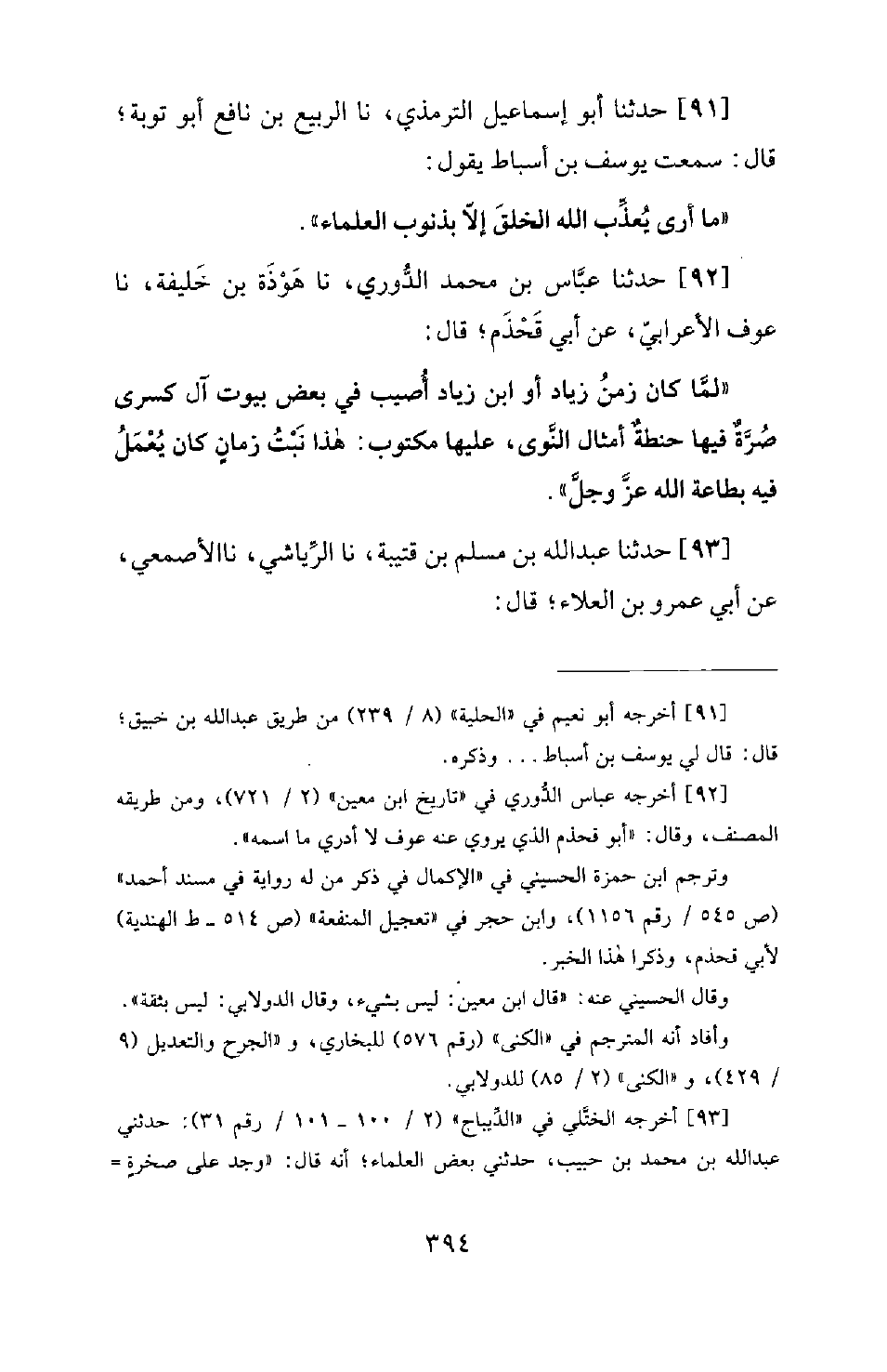 91 - حَدَّثَنَا أَبُو إِسْمَاعِيلَ التِّرْمِذِيُّ، نَا الرَّبِيعُ بْنُ نَافِعٍ أَبُو تَوْبَةَ؛ قَالَ: سَمِعْتُ يُوسُفَ بْنَ أَسْبَاطٍ يَقُولُ: مَا أَرَى يُعَذِّبُ اللهُ الْخَلْقَ إِلَّا بِذُنُوبِ الْعُلَمَاءِ.