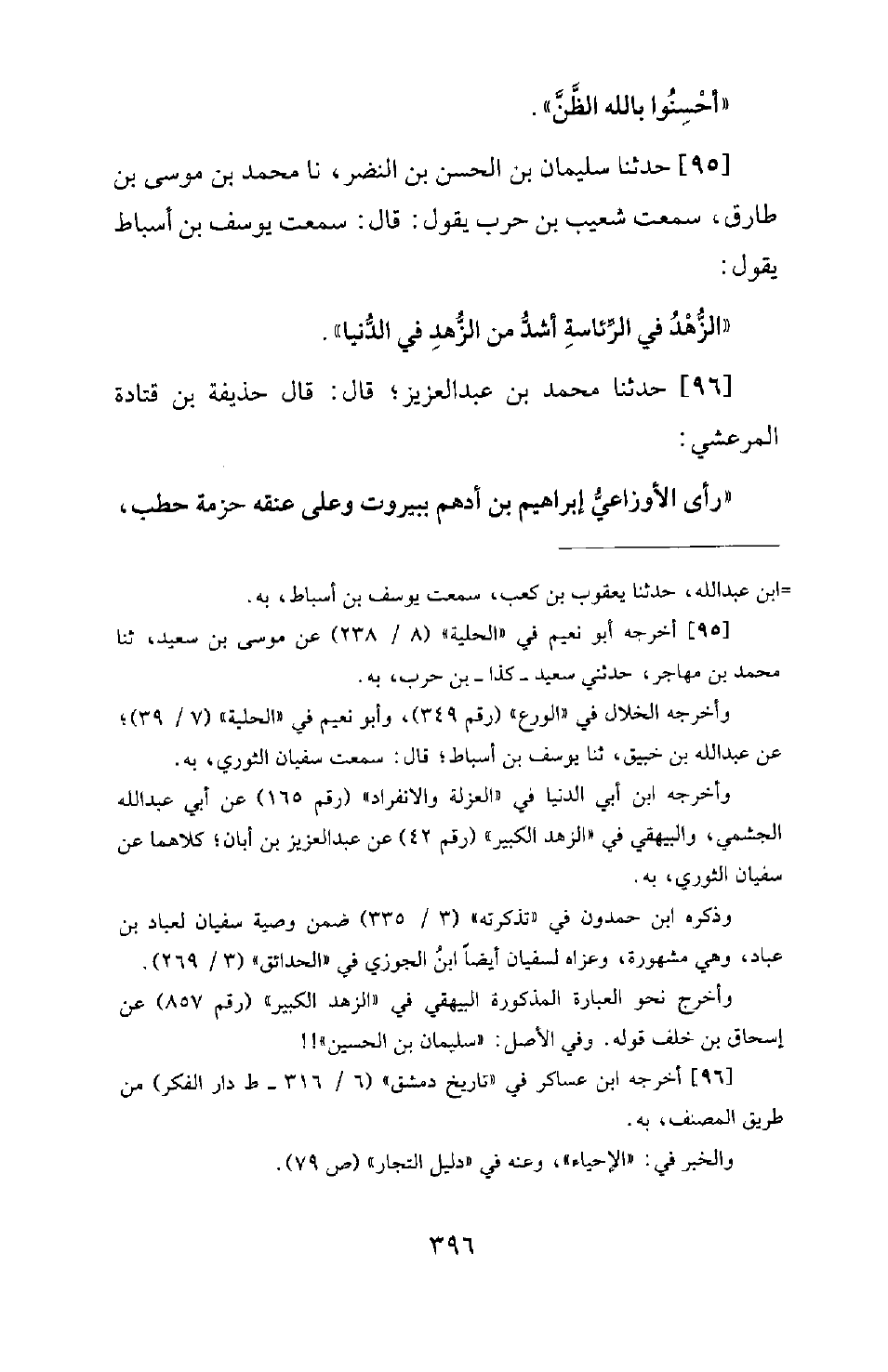 96 - حَدَّثَنَا مُحَمَّدُ بْنُ عَبْدِ الْعَزِيزِ؛ قَالَ: قَالَ حُذَيْفَةُ بْنُ قَتَادَةَ الْمَرْعَشِيُّ: رَأَى الْأَوْزَاعِيُّ إبراهيم بن أَدْهَمَ بِبَيْرُوتَ وَعَلَى عُنُقِهِ حِزْمَةُ حَطَبٍ، -[397]- فَقَالَ لَهُ: يَا أَبَا إِسْحَاقَ! إِلَى مَتَى هَذَا؟ إِخْوَانُكَ يَكْفُونَكَ. فَقَالَ: دَعْنِي عَنْ هَذَا يَا أَبَا عَمْرٍو؛ فَإِنَّهُ بَلَغَنِي أَنَّهُ مَنْ وَقَفَ مَوْقِفَ مَذَلَّةٍ فِي طَلَبِ الْحَلَالِ وَجَبَتْ لَهُ الْجَنَّةُ.