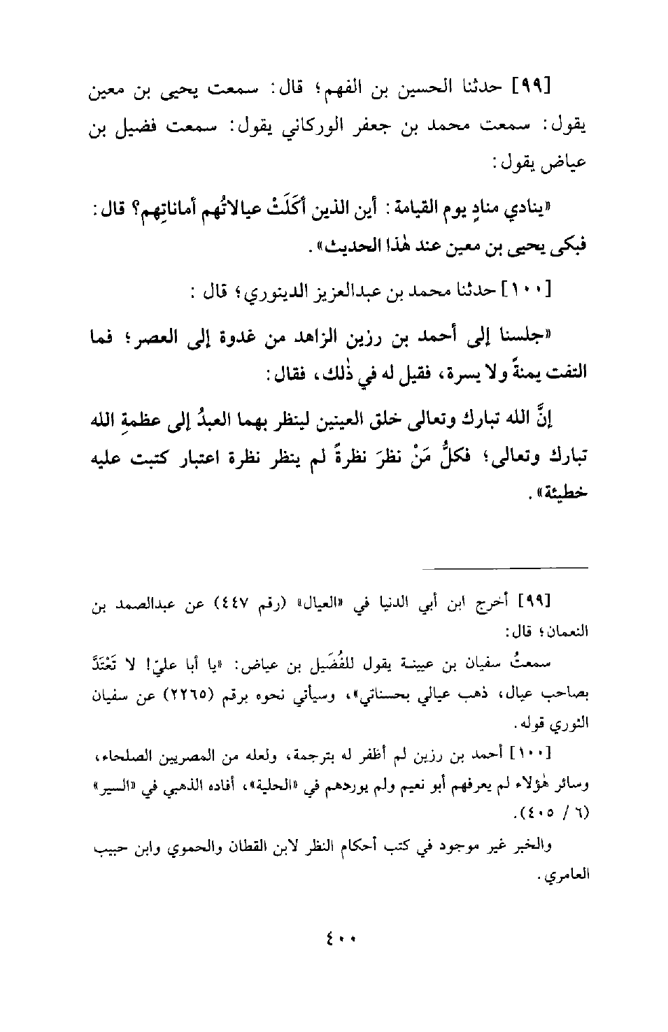 99 - حَدَّثَنَا الْحُسَيْنُ بْنُ الْفَهْمِ؛ قَالَ: سَمِعْتُ يَحْيَى بْنَ مَعِينٍ يَقُولُ: سَمِعْتُ مُحَمَّدَ بْنَ جَعْفَرٍ الوركاني يَقُولُ: سَمِعْتُ فُضَيْلَ بْنَ عِيَاضٍ يَقُولُ: يُنَادِي مُنَادٍ يَوْمَ الْقِيَامَةِ: أَيْنَ الَّذِينَ أَكَلَتْ عِيَالَاتُهُمْ أَمَانَاتِهِمْ؟ قَالَ: فَبَكَى يَحْيَى بْنُ مَعِينٍ عِنْدَ هَذَا الْحَدِيثِ.
