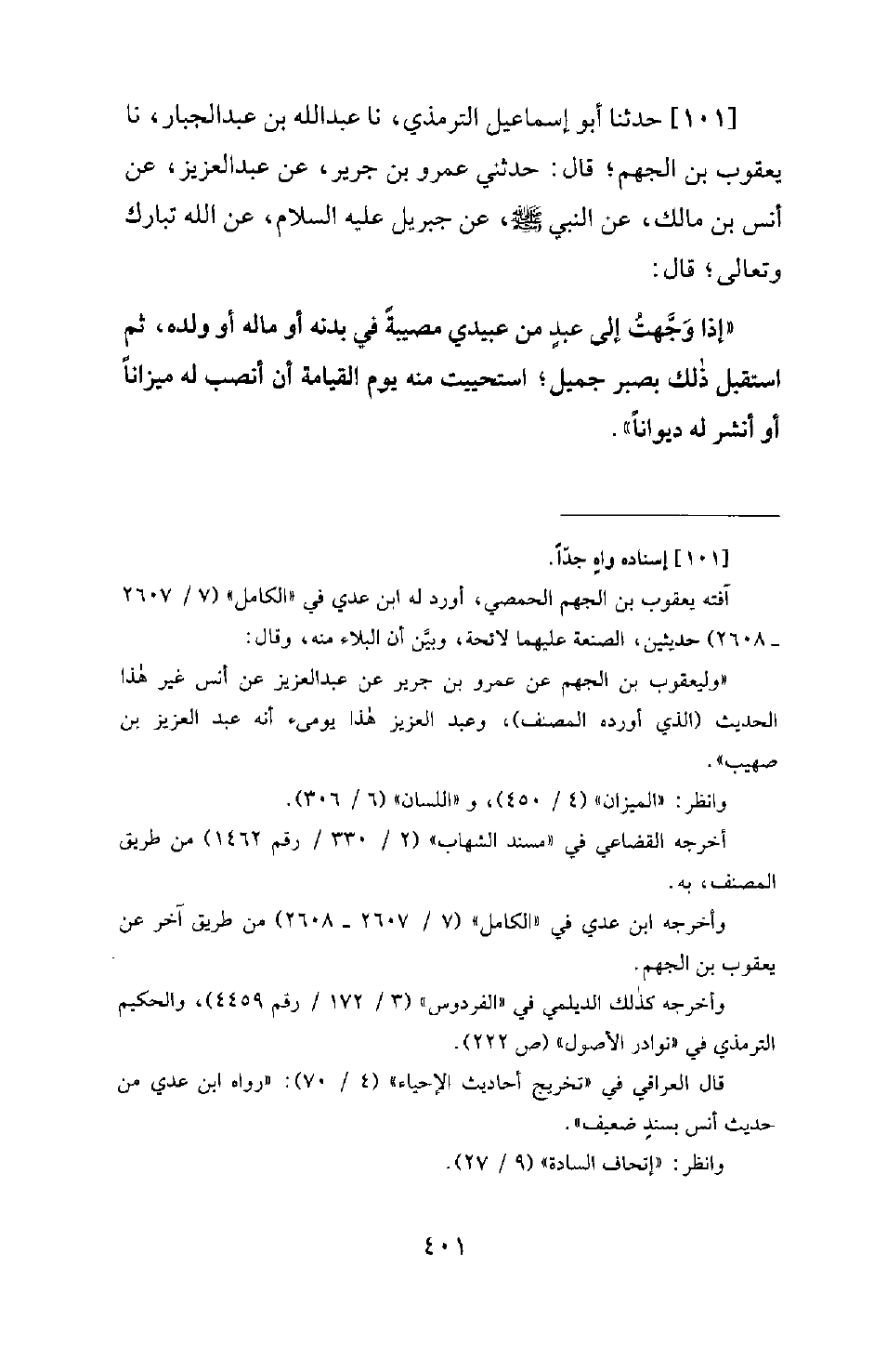 101 - حَدَّثَنَا أَبُو إِسْمَاعِيلَ التِّرْمِذِيُّ، نَا عَبْدُ اللهِ بْنُ عَبْدِ الْجَبَّارِ، نَا يَعْقُوبُ بْنُ الْجَهْمِ؛ قَالَ: حَدَّثَنِي عَمْرُو بْنُ جَرِيرٍ، عَنْ عَبْدِ الْعَزِيزِ، عَنْ أَنَسِ بْنِ مَالِكٍ، عَنِ النَّبِيِّ صَلَّى اللَّهُ عَلَيْهِ وَسَلَّمَ، عَنْ جِبْرِيلَ عَلَيْهِ السَّلَامُ، عَنِ اللهِ تَبَارَكَ وَتَعَالَى؛ قَالَ: «إِذَا وَجَّهْتُ إِلَى عَبْدٍ مِنْ عَبِيدِي مُصِيبَةً فِي بَدَنِهِ أَوْ مَالِهِ أَوْ وَلَدِهِ، ثُمَّ اسْتَقْبَلَ ذَلِكَ بِصَبْرٍ جَمِيلٍ؛ اسْتَحْيَيْتُ مِنْهُ يَوْمَ الْقِيَامَةِ أَنْ أَنْصِبَ لَهُ مِيزَانًا أو أن أَنْشُرَ لَهُ دِيوَانًا»