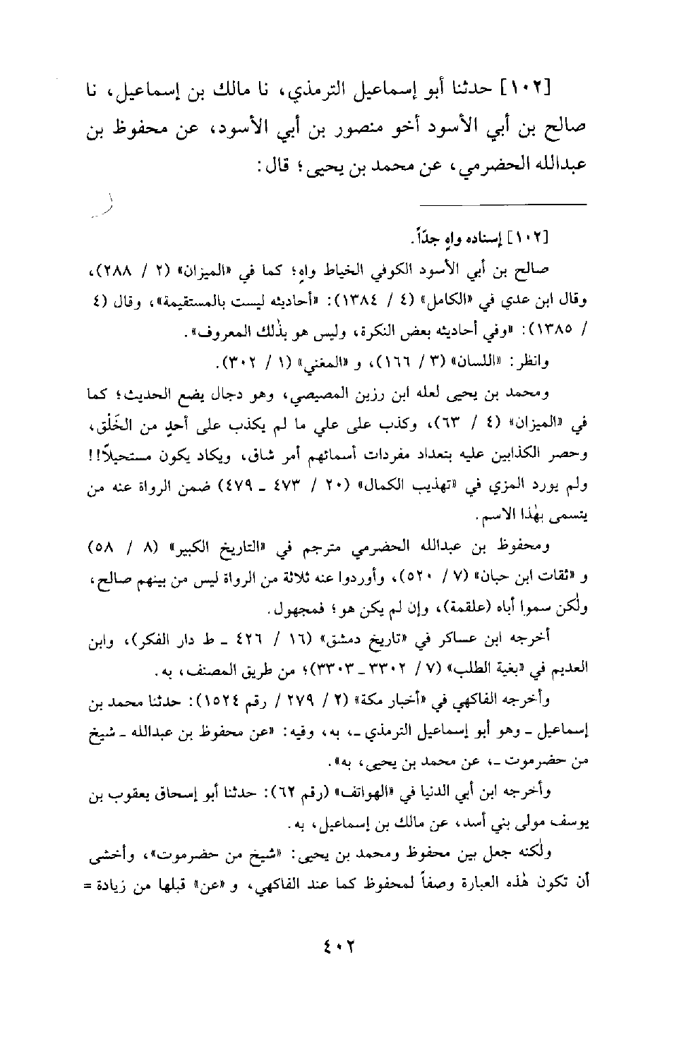 102 - حَدَّثَنَا أَبُو إِسْمَاعِيلَ التِّرْمِذِيُّ، نَا مَالِكُ بْنُ إِسْمَاعِيلَ، نَا صَالِحُ بْنُ أَبِي الْأَسْوَدِ أَخُو مَنْصُورِ بْنِ أَبِي الْأَسْوَدِ، عَنْ مَحْفُوظِ بْنِ عَبْدِ اللهِ الْحَضْرَمِيِّ، عَنْ مُحَمَّدِ بْنِ يَحْيَى؛ قَالَ: -[404]- بَيْنَمَا عَلِيُّ بْنُ أَبِي طَالِبٍ رَضِيَ اللهُ عَنْهُ يَطُوفُ بِالْكَعْبَةِ إِذَا هُوَ بِرَجُلٍ مُتَعَلِّقٍ بِأَسْتَارِ الْكَعْبَةِ وَهُوَ يَقُولُ: يَا مَنْ لَا يَشْغَلُهُ سَمْعٌ عَنْ سَمْعٍ! وَيَا مَنْ لَا يَغْلُطُهُ السَّائِلُونَ! يَا مَنْ لَا يَتَبَرَّمُ بِإِلْحَاحِ الْمُلِحِّينَ! أَذِقْنِي بَرْدَ عَفْوِكَ وَحَلَاوَةَ رَحْمَتِكَ. قَالَ: فَقَالَ [لَهُ] عَلِيٌّ رَضِيَ اللهُ عَنْهُ: يَا عَبْدَ اللهِ! دُعَاؤُكَ هَذَا؟ قَالَ: وَقَدْ سَمِعْتَهُ؟ قَالَ: نَعَمْ. قَالَ: فَادْعُ اللهَ بِهِ دُبُرَ كُلِّ صَلَاةٍ؛ فَوَالَّذِي نَفْسُ الْخَضِرِ بِيَدِهِ؛ لَوْ كَانَ عَلَيْكَ مِنَ الذُّنُوبِ عَدَدُ نُجُومِ السَّمَاءِ وَمَطَرِهَا، وَحَصْبَاءِ الْأَرْضِ وَتُرَابِهَا؛ لَغُفِرَ لَكَ أَسْرَعُ مِنْ طَرْفَةِ عَيْنٍ