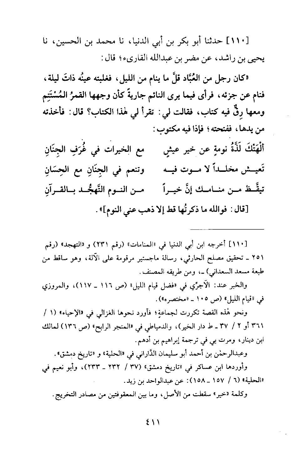 110 - حَدَّثَنَا أَبُو بَكْرِ بْنُ أَبِي الدُّنْيَا، نَا مُحَمَّدُ بْنُ الْحُسَيْنِ، نَا يَحْيَى بْنُ رَاشِدٍ؛ عَنْ مُضَرَ بْنِ عَبْدِ اللهِ الْقَارِئِ؛ قَالَ: كَانَ رَجُلٌ من العُبَّاد قلَّ من يَنَامُ مِنَ اللَّيْلِ، فَغَلَبَتْهُ عَيْنُهُ ذَاتَ لَيْلَةٍ، فَنَامَ عَنْ جُزْئِهِ، فَرَأَى فِيمَا يَرَى النَّائِمُ جَارِيَةً كَأَنَّ وَجْهَهَا الْقَمَرُ الْمُسْتَتِمُّ وَمَعَهَا رِقٌّ فِيهِ كِتَابٌ، فَقَالَتْ لِي: تَقْرَأُ لِي هَذَا الْكِتَابَ؟ قَالَ: فَأَخَذْتُهُ مِنْ يَدِهَا، فَفَتَحْتُهُ؛ فَإِذَا فِيهِ مَكْتُوبٌ:
