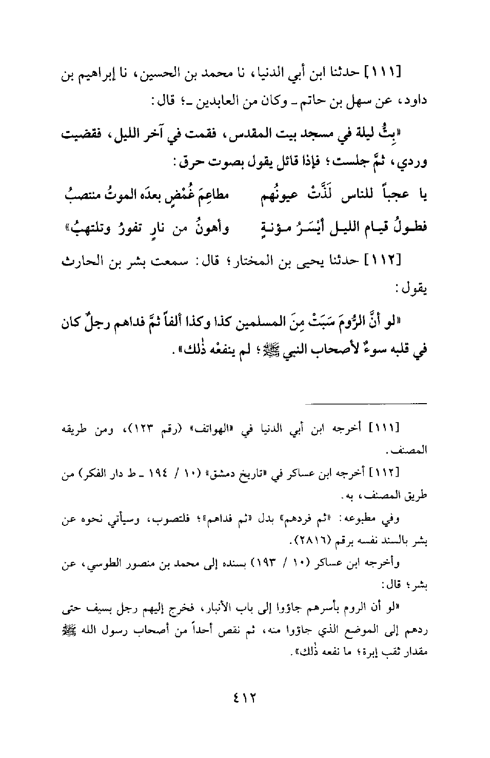 111 - حَدَّثَنَا ابْنُ أَبِي الدُّنْيَا، نَا مُحَمَّدُ بْنُ الْحُسَيْنِ، نَا إِبْرَاهِيمُ بْنُ دَاوُدَ، عَنْ سَهْلِ بْنِ حَاتِمٍ - وَكَانَ مِنَ الْعَابِدِينَ -؛ قَالَ: بِتُّ لَيْلَةً فِي مَسْجِدِ بَيْتِ الْمَقْدِسِ، فَقُمْتُ فِي آخِرِ اللَّيْلِ، فَقَضَيْتُ وِرْدِي، ثُمَّ جَلَسْتُ؛ فَإِذَا قَائِلٌ يَقُولُ بِصَوْتِ حَرْقٍ: