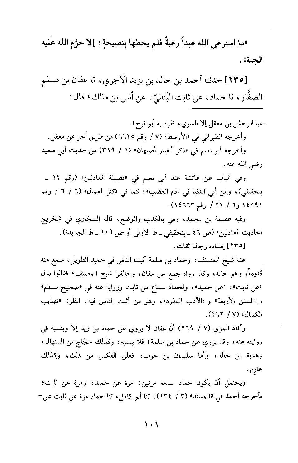 235 - حَدَّثَنَا أَحْمَدُ بْنُ خَالِدِ بْنِ يَزِيدَ الْآجُرِّيُّ، نَا عَفَّانُ بْنُ مُسْلِمٍ الصَّفَّارُ، نَا حَمَّادٌ، عَنْ ثَابِتٍ الْبُنَانِيُّ، عَنْ أَنَسِ بْنِ مَالِكٍ؛ قَالَ: -[103]- لَمْ يَكُنْ شَخْصٌ أَحَبُّ إِلَيْهِمْ مِنْ رَسُولِ اللهِ صَلَّى اللَّهُ عَلَيْهِ وَسَلَّمَ، وَكَانُوا إِذَا رَأَوْهُ لَمْ يَقُومُوا لَهُ لِمَا يَعْلَمُونَ مِنْ كَرَاهِيَتِهِ