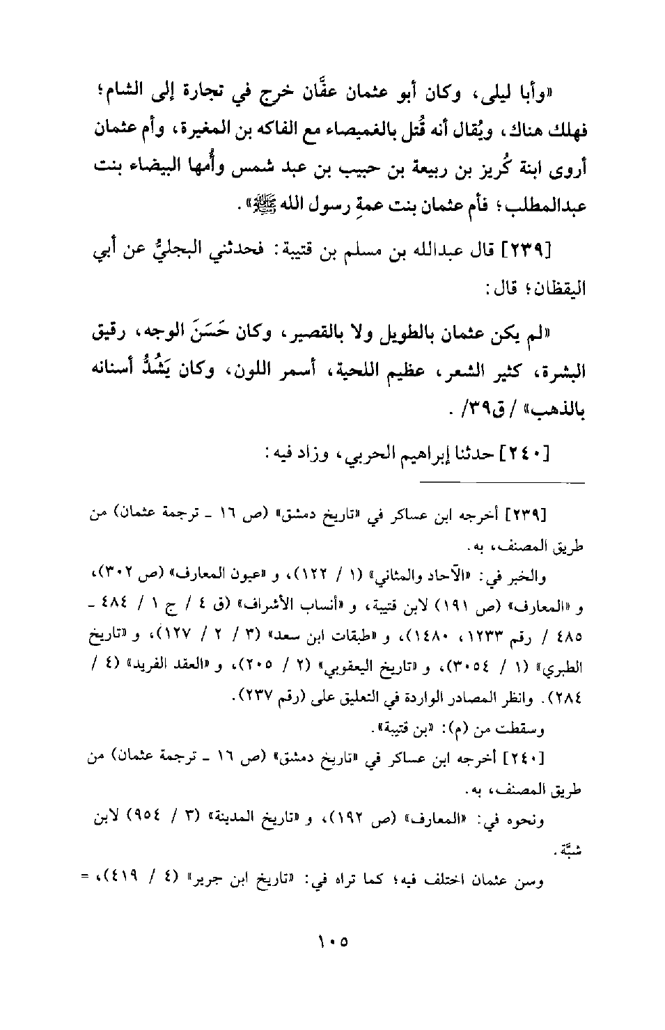 239 - قَالَ عَبْدُ اللهِ بْنُ مُسْلِمِ بْنِ قُتَيْبَةَ: فَحَدَّثَنِي الْبَجَلِيُّ عَنْ أَبِي الْيَقْظَانِ؛ قَالَ: لَمْ يَكُنْ عُثْمَانُ بِالطَّوِيلِ وَلَا بِالْقَصِيرِ، وَكَانَ حَسَنَ الْوَجْهِ، رَقِيقَ الْبَشْرَةِ، كَثِيرَ الشَّعْرِ، عَظِيمَ اللِّحْيَةِ، أَسْمَرَ اللَّوْنِ، وَكَانَ يَشُدُّ أَسْنَانَهُ بِالذَّهَبِ.