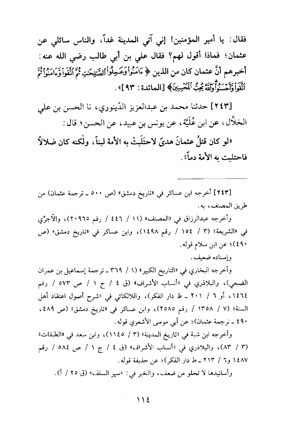 243 - حَدَّثَنَا مُحَمَّدُ بْنُ عَبْدِ الْعَزِيزِ الدَّيْنَوَرِيُّ، نَا الْحَسَنُ بْنُ عَلِيٍّ الْخَلَّالُ، عَنِ ابْنِ عُلَيَّةَ، عَنْ يُونُسَ بْنِ عُبَيْدٍ، عَنِ الْحَسَنِ؛ قَالَ: لَوْ كَانَ قَتْلِ عُثْمَانَ هُدًى لَاحْتَلَبَتْ بِهِ الْأُمَّةُ لبناً، ولكنه كان ضلالاً فَاحْتَلَبَتْ بِهِ الْأُمَّةُ دَمًا.