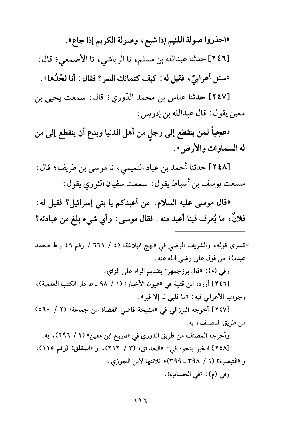 247 - حَدَّثَنَا عَبَّاسُ بْنُ مُحَمَّدٍ الدُّورِيُّ؛ قَالَ: سَمِعْتُ يَحْيَى بْنُ مَعِينٍ يَقُولُ: قَالَ عَبْدُ اللهِ بْنُ إِدْرِيسَ: عَجَبًا لِمَنْ يَنْقَطِعُ إِلَى رَجُلٍ مِنْ أَهْلِ الدُّنْيَا وَيَدَعُ أَنْ يَنْقَطِعَ إِلَى مَنْ له السماوات وَالْأَرْضُ.