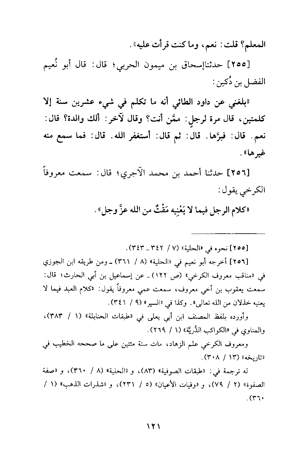 255 - حَدَّثَنَا إِسْحَاقُ بْنُ مَيْمُونٍ الْحَرْبِيُّ؛ قَالَ: قَالَ أَبُو نُعَيْمٍ الْفَضْلُ بْنُ دُكَيْنٍ: بَلَغَنِي عَنْ دَاوُدَ الطَّائِيِّ أَنَّهُ ما تكلم في شَيْءٍ عِشْرِينَ سَنَةً إِلَّا كَلِمَتَيْنِ، قَالَ مَرَّةً لِرَجُلٍ: مِمَّنْ أَنْتَ؟ وَقَالَ لِآخَرَ: أَلَكَ وَالِدَةٌ؟ قَالَ: نَعَمْ: قَالَ: فَبِرَّهَا. قَالَ: ثُمَّ قَالَ أَسْتَغْفِرُ اللهَ. قَالَ: فَمَا سَمِعَ مِنْهُ غَيْرَهَا.
