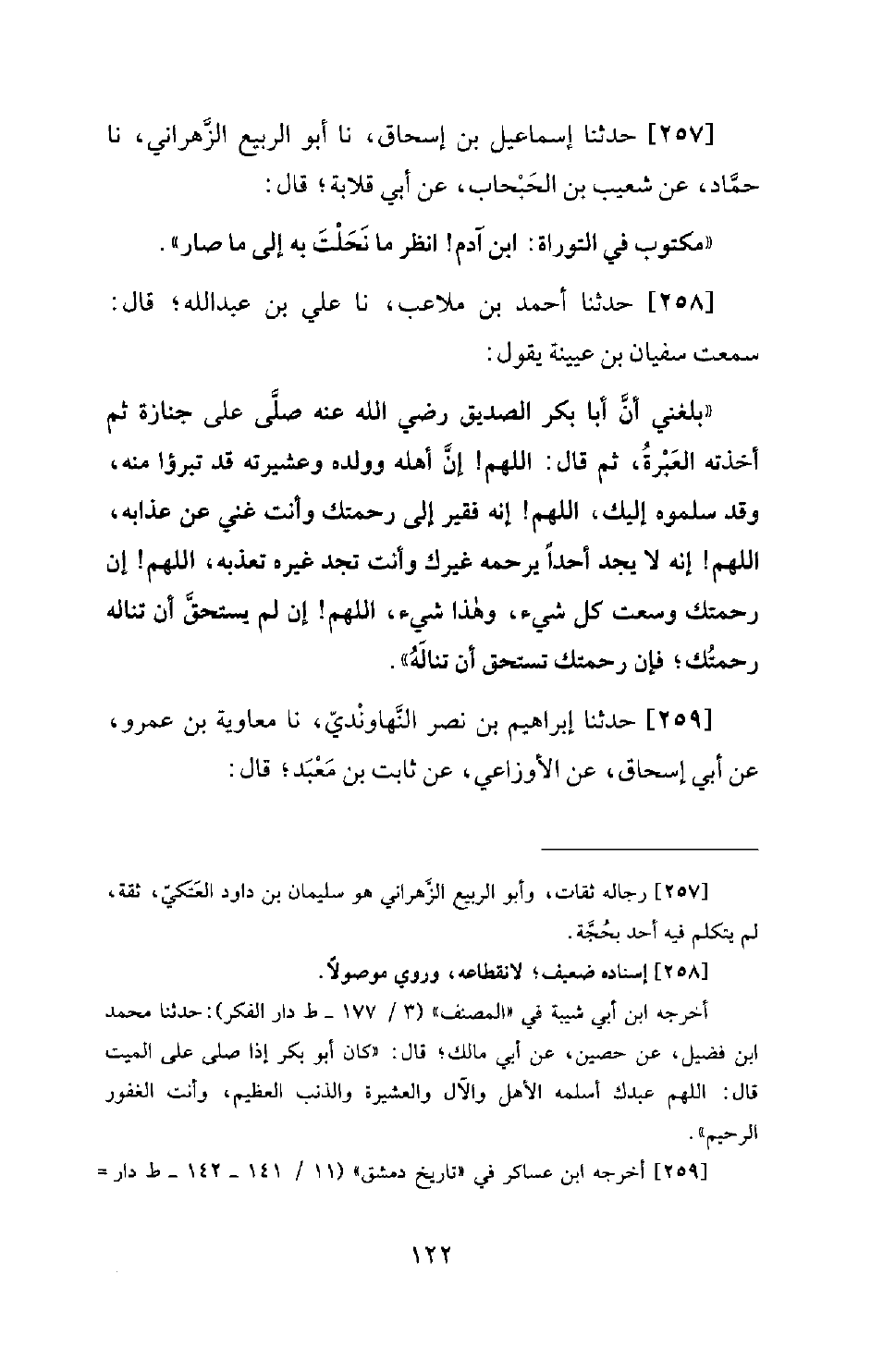 258 - حَدَّثَنَا أَحْمَدُ بْنُ مُلَاعِبٍ، نَا عَلِيُّ بْنُ عَبْدِ اللهِ؛ قَالَ: سَمِعْتُ سُفْيَانَ بْنَ عُيَيْنَةَ يَقُولُ: بَلَغَنِي أَنَّ أَبَا بَكْرٍ الصِّدِّيقَ رَضِيَ اللهُ عَنْهُ صَلَّى عَلَى جِنَازَةٍ ثُمَّ أَخَذَتْهُ الْعَبْرَةُ، ثُمَّ قَالَ: اللهُمَّ! إِنَّ أَهْلَهُ وَوَلَدَهُ وَعَشِيرَتَهُ قَدْ تبرؤوا مِنْهُ، وَقَدْ سَلَّمُوهُ إِلَيْكَ، اللهُمَّ! إِنَّهُ فَقِيرٌ إِلَى رَحْمَتِكَ وَأَنْتَ غَنِيٌّ عَنْ عَذَابِهِ، اللهُمَّ! إِنَّهُ لَا يَجِدُ أَحَدًا يَرْحَمُهُ غَيْرَكَ وَأَنْتَ تَجِدُ غَيْرَهُ تُعَذِّبُهُ، اللهُمَّ! إِنَّ رَحْمَتَكَ وَسِعَتْ كُلَّ شَيْءٍ، وَهَذَا شَيْءٌ، اللهُمَّ! إِنْ لَمْ يَسْتَحِقَّ أَنْ تَنَالَهُ رَحْمَتُكَ؛ فَإِنَّ رَحْمَتَكَ تَسْتَحِقُّ أَنْ تَنَالَهُ