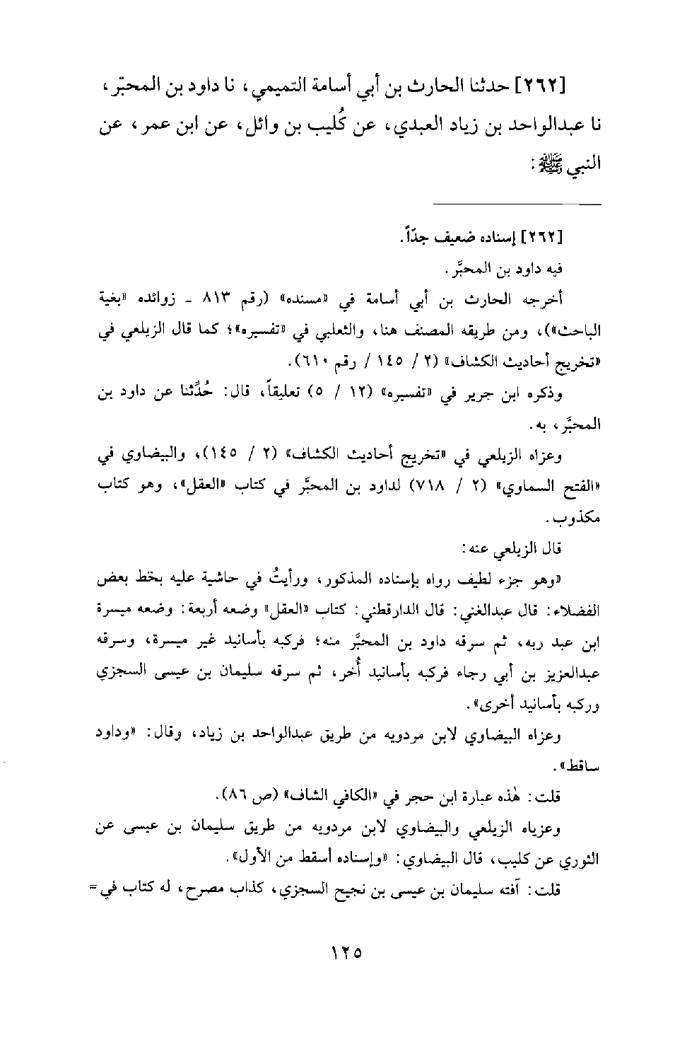 262 - حَدَّثَنَا الْحَارِثُ بْنُ أَبِي أُسَامَةَ التَّمِيمِيُّ، نَا دَاوُدُ بْنُ الْمُحَبَّرِ، نَا عَبْدُ الْوَاحِدِ بْنُ زِيَادٍ الْعَبْدِيُّ، عَنْ كُلَيْبِ بْنِ وَائِلٍ، عَنِ ابْنِ عُمَرَ، عَنِ النَّبِيِّ صَلَّى اللَّهُ عَلَيْهِ وَسَلَّمَ: -[126]- أَنَّهُ تَلَا: {تَبَارَكَ الَّذِي بِيَدِهِ الْمُلْكُ} حَتَّى بَلَغَ: {أيكم أحسن عملا} [الملك: 1، 2] ، ثُمَّ قَالَ: «أَيُّكُمْ أَحْسَنُ عقلاً، وأورع عَنْ مَحَارِمِ اللهِ، وَأَسْرَعُهُمْ فِي طَاعَةِ اللهِ عَزَّ وَجَلَّ؟»