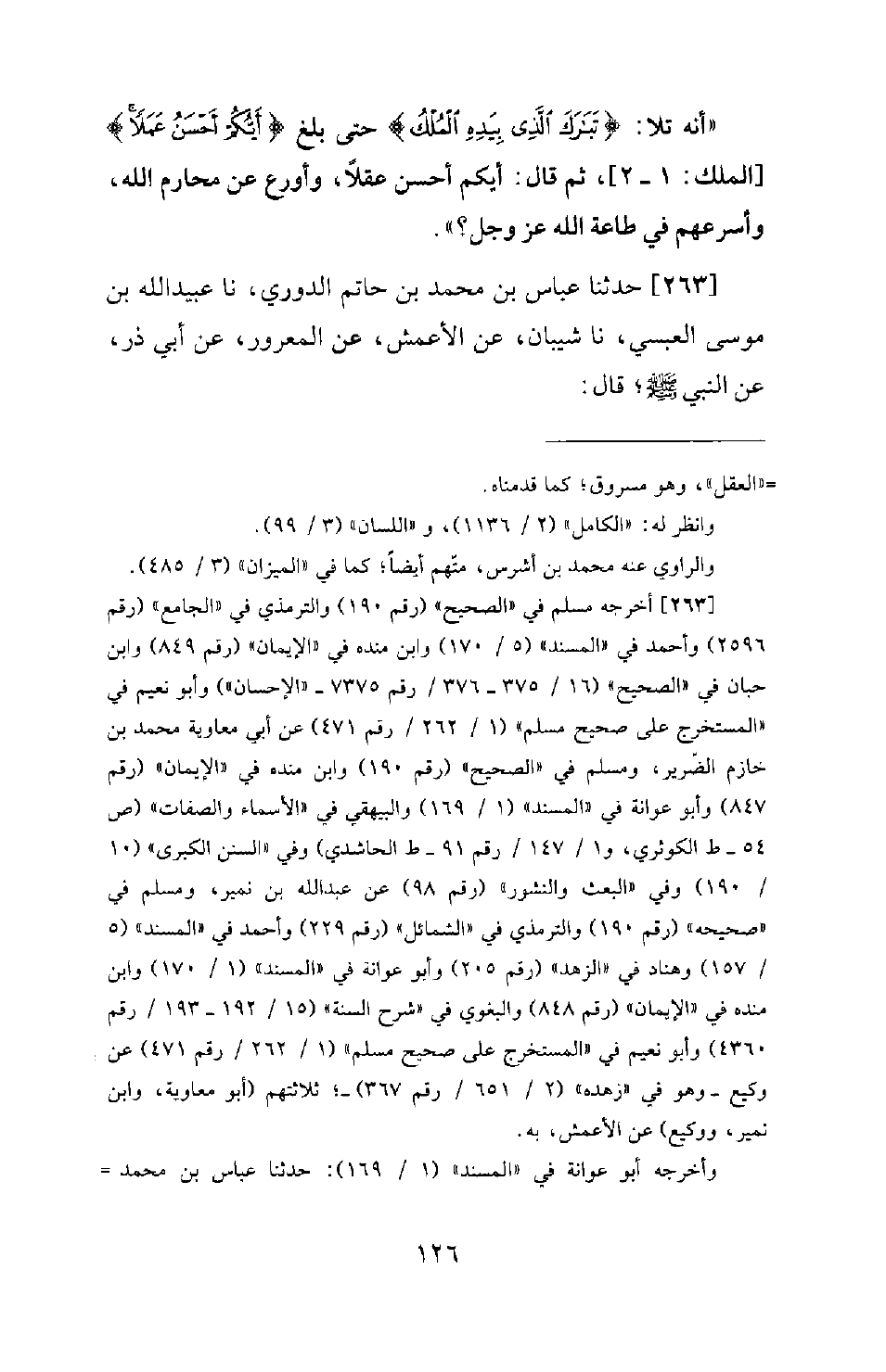 263 - حَدَّثَنَا عَبَّاسُ بْنُ مُحَمَّدِ بْنِ حَاتِمٍ الدُّورِيُّ، نَا عُبَيْدُ اللهِ بْنُ مُوسَى الْعَبْسِيُّ، نَا شَيْبَانُ، عَنِ الْأَعْمَشِ، عَنِ الْمَعْرُورِ، عَنْ أَبِي ذَرٍّ، عَنِ النَّبِيِّ صَلَّى اللَّهُ عَلَيْهِ وَسَلَّمَ؛ قَالَ -[127]-: «لَقَدْ عَلِمْتُ آخِرَ أَهْلِ النَّارِ خُرُوجًا مِنَ النَّارِ، وَآخِرَ أَهْلِ الْجَنَّةِ دُخُولًا الْجَنَّةَ؛ رَجُلٌ يُؤْتَى بِهِ، فَيُعْرَضُ عَلَيْهِ سيئاته، وتُخَبَّىء عَلَيْهِ كَبَائِرُهُ، فَيُقَالُ لَهُ: أَتَذْكُرُ يَوْمَ عَمِلْتَ كَذَا وَكَذَا؟ فَيَقُولُ: نَعَمْ. وَهُوَ مُشْفِقٌ مِنَ الْكَبَائِرِ أَنْ تُعْرَضَ عَلَيْهِ، فَإِذَا فَرَغَ مِنْ عَرْضِ السَّيِّئَاتِ؛ قِيلَ له: اذهب؛ فإن لك بِكُلِّ سَيِّئَةٍ حَسَنَةً. فَيَقُولُ: قَدْ كَانَتْ لِي ذُنُوبٌ لَا أَرَاهَا!» . قَالَ: فَكَانَ النَّبِيُّ صَلَّى اللَّهُ عَلَيْهِ وَسَلَّمَ إِذَا ذَكَرَ هَذَا الْحَدِيثَ يَضْحَكُ حَتَّى تَبْدُوَ نَوَاجِذُهُ