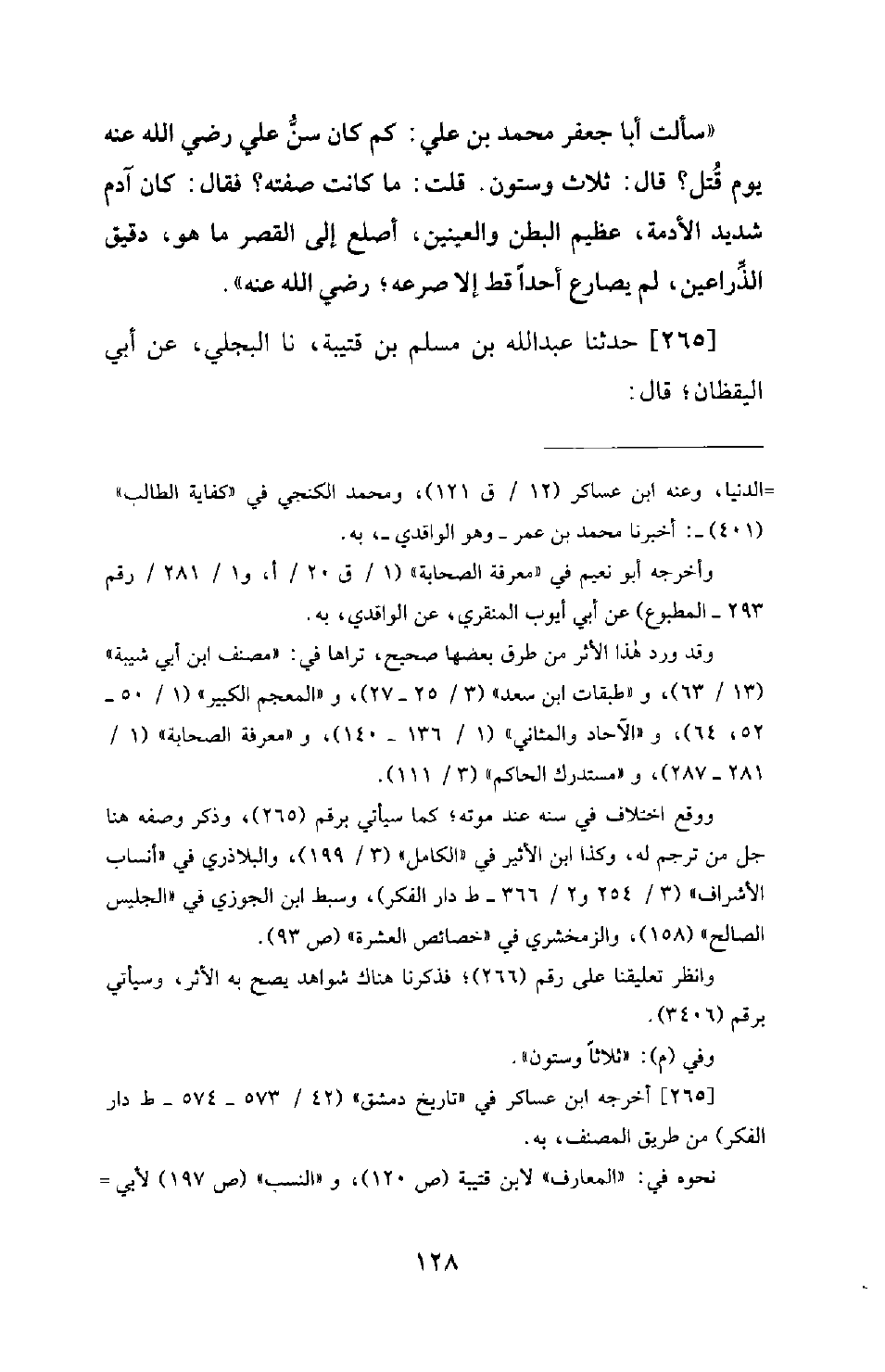 265 - حَدَّثَنَا عَبْدُ اللهِ بْنُ مُسْلِمِ بْنِ قُتَيْبَةَ، نَا الْبَجَلِيُّ، عَنْ أَبِي الْيَقْظَانِ؛ قَالَ: -[130]- اخْتُلِفَ فِي قَتْلِ عَلِيٍّ رَضِيَ اللهُ عَنْهُ، فَقَالَ بَعْضُهُمْ: قُتِلَ وَهُوَ ابْنُ ثَلَاثٍ وَسِتِّينَ، وَقَالَ بَعْضُهُمْ: ابْنُ ثَمَانٍ وَخَمْسِينَ، وَدُفِنَ بِالْكُوفَةِ، وَصَلَّى عَلَيْهِ الْحَسَنُ بْنُ عَلِيٍّ، وَدُفِنَ عِنْدَ مَسْجِدِ الْجَامِعِ فِي قَصْرِ الْإِمَارَةِ، وَكَانَتْ وِلَايَتُهُ خَمْسَ سِنِينَ إِلَّا ثَلَاثَةَ أَشْهُرٍ، وَقُتِلَ لَيْلَةَ الْجُمُعَةِ لِسَبْعَ عَشْرَةَ لَيْلَةً مَضَتْ مِنْ شَهْرِ رَمَضَانَ سَنَةَ أَرْبَعِينَ، وَأُمُّهُ فَاطِمَةُ بِنْتُ أَسَدِ بْنِ هَاشِمِ بْنِ عَبْدِ مَنَافٍ، وَأَسْلَمَتْ قَدِيمًا، وَهِيَ أَوَّلُ هَاشِمِيَّةٍ وُلِدَتْ لِهَاشِمِيٍّ، وَهِيَ رَبَّتِ النَّبِيَّ صَلَّى اللَّهُ عَلَيْهِ وَسَلَّمَ، وَيَوْمَ مَاتَتْ صَلَّى النَّبِيُّ صَلَّى اللَّهُ عَلَيْهِ وَسَلَّمَ عَلَيْهَا وَتَمَرَّغَ فِي قَبْرِهَا وَبَكَى، وَقَالَ: «جَزَاكِ اللهُ مِنْ أُمٍّ خَيْرًا؛ فَقَدْ كُنْتِ خَيْرَ أُمٍّ» ، وَوَلَدَتْ لِأَبِي طَالِبٍ عُقَيْلًا وَجَعْفَرًا وَعَلِيًّا وَأُمَّ هَانِئٍ - وَاسْمُهَا فَاخِتَةُ - وَجُمَانَةَ، وَكَانَ عُقَيْلٌ أَسَنَّ مِنْ جَعْفَرٍ بَعَشْرِ سِنِينَ، وَجَعْفَرٌ أَسَنَّ مِنْ عَلِيٍّ بَعَشْرِ سِنِينَ، وَجَعْفَرٌ هُوَ ذُو الْهِجْرَتَيْنِ وَذُو الْجَنَاحَيْنِ.