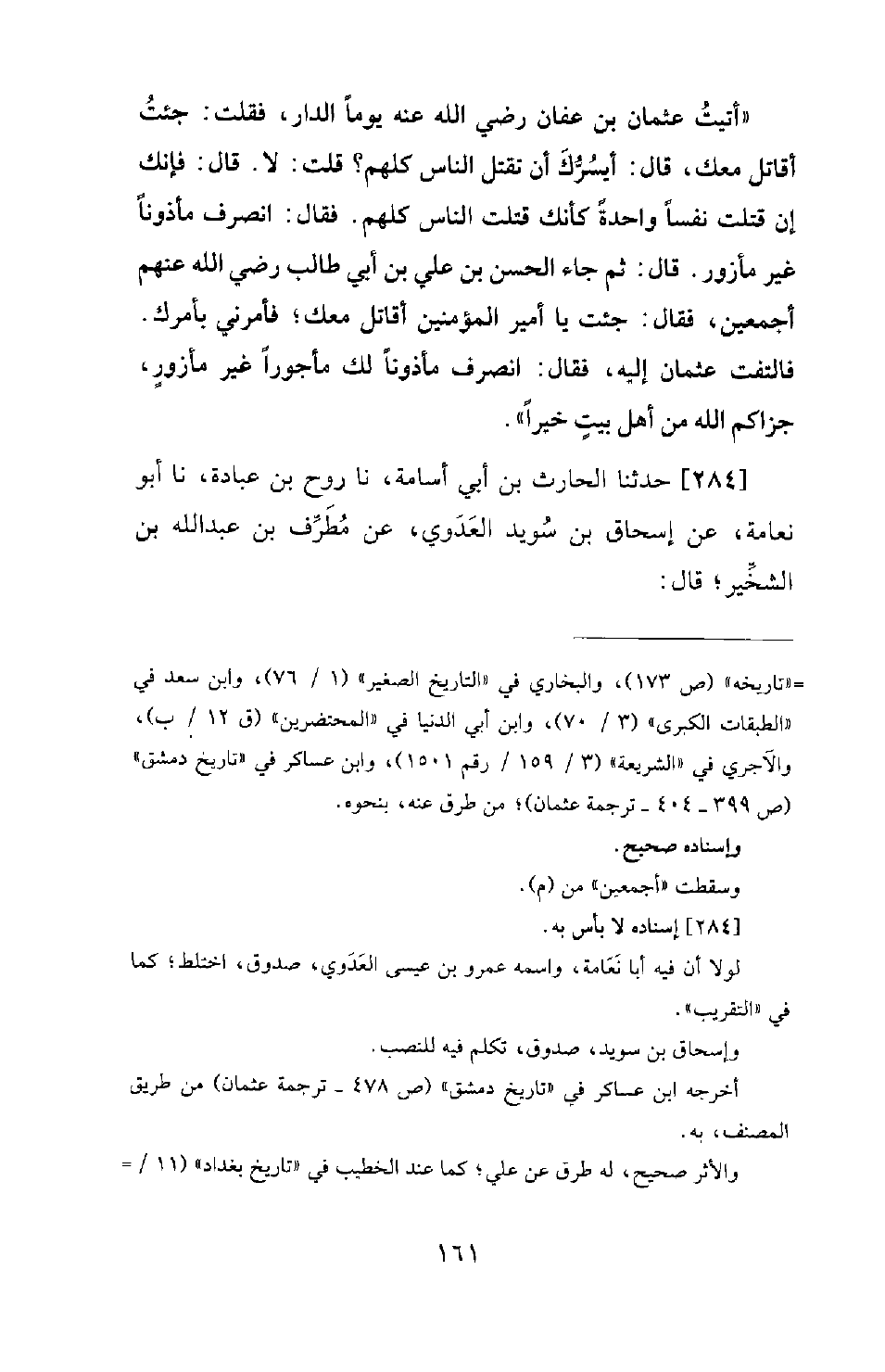 284 - حَدَّثَنَا الْحَارِثُ بْنُ أَبِي أُسَامَةَ، نَا رَوْحُ بْنُ عُبَادَةَ، نَا أَبُو نَعَامَةَ، عَنْ إِسْحَاقَ بْنِ سُوَيْدٍ الْعَدَوِيِّ، عَنْ مُطَرِّفِ بْنِ عَبْدِ اللهِ بْنِ الشِّخِّيرِ؛ قَالَ: -[162]- لَقِيتُ عَلِيَّ بْنَ أَبِي طَالِبٍ رَضِيَ اللهُ عَنْهُ بِهَذَا الحَرِيز، فَسَأَلْتُهُ عَنْ عُثْمَانَ بْنِ عَفَّانَ رَضِيَ اللهُ عَنْهُ؛ قَالَ: لَقَدْ كَانَ مِنْ خَيْرِنَا وَأَوْصَلِنَا لِلرَّحِمِ