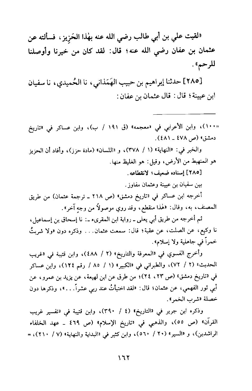 285 - حَدَّثَنَا إِبْرَاهِيمُ بْنُ حَبِيبٍ الْهَمَذَانِيُّ، نَا الْحُمَيْدِيُّ، نَا سُفْيَانُ بْنُ عُيَيْنَةَ؛ قَالَ: قَالَ عُثْمَانُ بْنُ عَفَّانَ: -[164]- مَا تَغَنِّيْتُ وَلَا تَمَنَّيْتُ وَلَا شَرِبْتُ خَمْرًا فِي جَاهِلِيَّةٍ وَلَا إِسْلَامٍ، وَلَا مَسَسْتُ فَرْجِي بِيَمِينِي مُذْ بَايَعْتُ رَسُولَ اللهِ صَلَّى اللَّهُ عَلَيْهِ وَسَلَّمَ