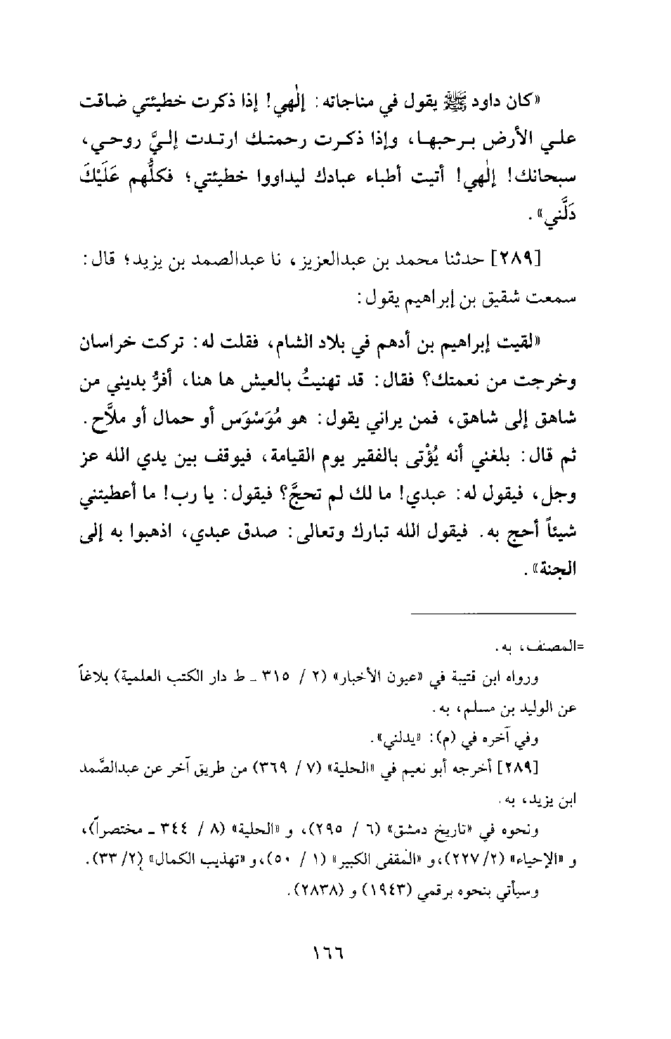 289 - حَدَّثَنَا مُحَمَّدُ بْنُ عَبْدِ الْعَزِيزِ، نَا عَبْدُ الصَّمَدِ بْنُ يَزِيدَ؛ قَالَ: سَمِعْتُ شَقِيقَ بْنَ إِبْرَاهِيمَ يَقُولُ: لَقِيتُ إِبْرَاهِيمَ بْنَ أَدْهَمَ فِي بِلَادِ الشَّامِ، فَقُلْتُ لَهُ: تَرَكْتَ خُرَاسَانَ وَخَرَجْتَ مِنْ نِعْمَتِكَ؟ فَقَالَ: قَدْ تَهَنَّيْتُ بِالْعَيْشِ هَاهُنَا، أَفِرُّ بِدِينِي مِنْ شَاهِقٍ إِلَى شَاهِقٍ، فَمَنْ يَرَانِي يَقُولُ: هُوَ مُوَسْوَسٌ أَوْ حَمَّالٌ أَوْ مَلَّاحٌ. ثُمَّ قَالَ: بَلَغَنِي أَنَّهُ يُؤْتَى بِالْفَقِيرِ يَوْمَ الْقِيَامَةِ، فَيُوقَفُ بَيْنَ يَدَيِ اللهِ عَزَّ وَجَلَّ، فَيَقُولُ لَهُ: عَبْدِي! مَا لَكَ لَمْ تَحُجَّ؟ فَيَقُولُ: يَا رَبِّ! مَا أَعْطَيْتَنِي شَيْئًا أَحُجُّ بِهِ. فَيَقُولُ اللهُ تَبَارَكَ وَتَعَالَى: صَدَقَ عَبْدِي، اذْهَبُوا بِهِ إِلَى الْجَنَّةِ.