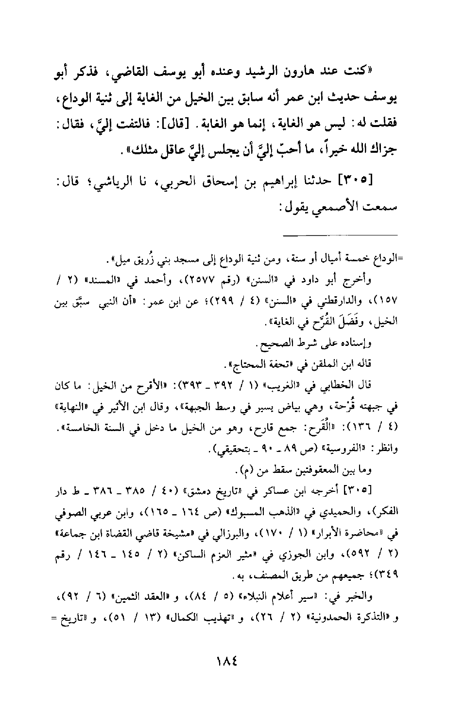 305 - حَدَّثَنَا إِبْرَاهِيمُ بْنُ إِسْحَاقَ الْحَرْبِيُّ، نَا الرِّيَاشِيُّ، قَالَ: سَمِعْتُ الْأَصْمَعِيَّ يَقُولُ: -[185]- دَخَلَ عَطَاءُ بْنُ أَبِي رَبَاحٍ عَلَى عَبْدِ الْمَلِكِ بْنِ مَرْوَانَ وَهُوَ جَالِسٌ عَلَى سَرِيرٍ وَحَوَالَيْهِ الْأَشْرَافُ مِنْ كُلِّ بَطْنٍ، وَذَلِكَ بِمَكَّةَ فِي وَقْتِ حَجِّهِ فِي خِلَافَتِهِ، فَلَمَّا بَصُرَ بِهِ قَامَ إِلَيْهِ، فَسَلَّمَ عَلَيْهِ وَأَجْلَسَهُ مَعَهُ عَلَى السَّرِيرِ، وَقَعَدَ بَيْنَ يَدَيْهِ، وَقَالَ لَهُ: يَا أَبَا مُحَمَّدٍ! حَاجَتُكَ؟ فَقَالَ: يَا أَمِيرَ الْمُؤْمِنِينَ! اتَّقِ اللهَ فِي حَرَمِ اللهِ وَحَرَمِ رَسُولِهِ؛ فَتَعَاهَدَهُ بِالْعِمَارَةِ، وَاتَّقِ اللهَ فِي أَوْلَادِ الْمُهَاجِرِينَ وَالْأَنْصَارِ؛ فَإِنَّكَ بِهِمْ جَلَسْتَ هَذَا الْمَجْلِسَ، وَاتَّقِ اللهَ فِي أَهْلِ الثُّغُورِ؛ فَإِنَّهُمْ حِصْنٌ لِلْمُسْلِمِينَ، وَتَفَقَّدْ أُمُورَ الْمُسْلِمِينَ؛ فَإِنَّكَ وحدك المسؤول عَنْهُمْ، وَاتَّقِ اللهَ فِيمَنْ عَلَى بَابِكَ؛ فَلَا تَغْفُلْ عَنْهُمْ وَلَا تُغْلِقْ دُونَهُمْ بَابَكَ. فَقَالَ لَهُ: أَفْعَلُ. ثُمَّ نَهَضَ وَقَامَ؛ فَقَبَضَ عَلَيْهِ عَبْدُ الْمَلِكِ، فَقَالَ: يَا أَبَا مُحَمَّدٍ! إِنَّمَا سَأَلْتَ حَوَائِجَ غَيْرِكَ وَقَدْ قَضَيْنَاهَا؛ فَمَا حَاجَتُكَ؟ فَقَالَ: ما لي إِلَى مَخْلُوقٍ حَاجَةٌ. ثُمَّ خَرَجَ. فَقَالَ عَبْدُ الْمَلِكِ: هَذَا وَأَبِيكَ الشَّرَفُ، هَذَا وَأَبِيكَ السُّؤْدُدُ.