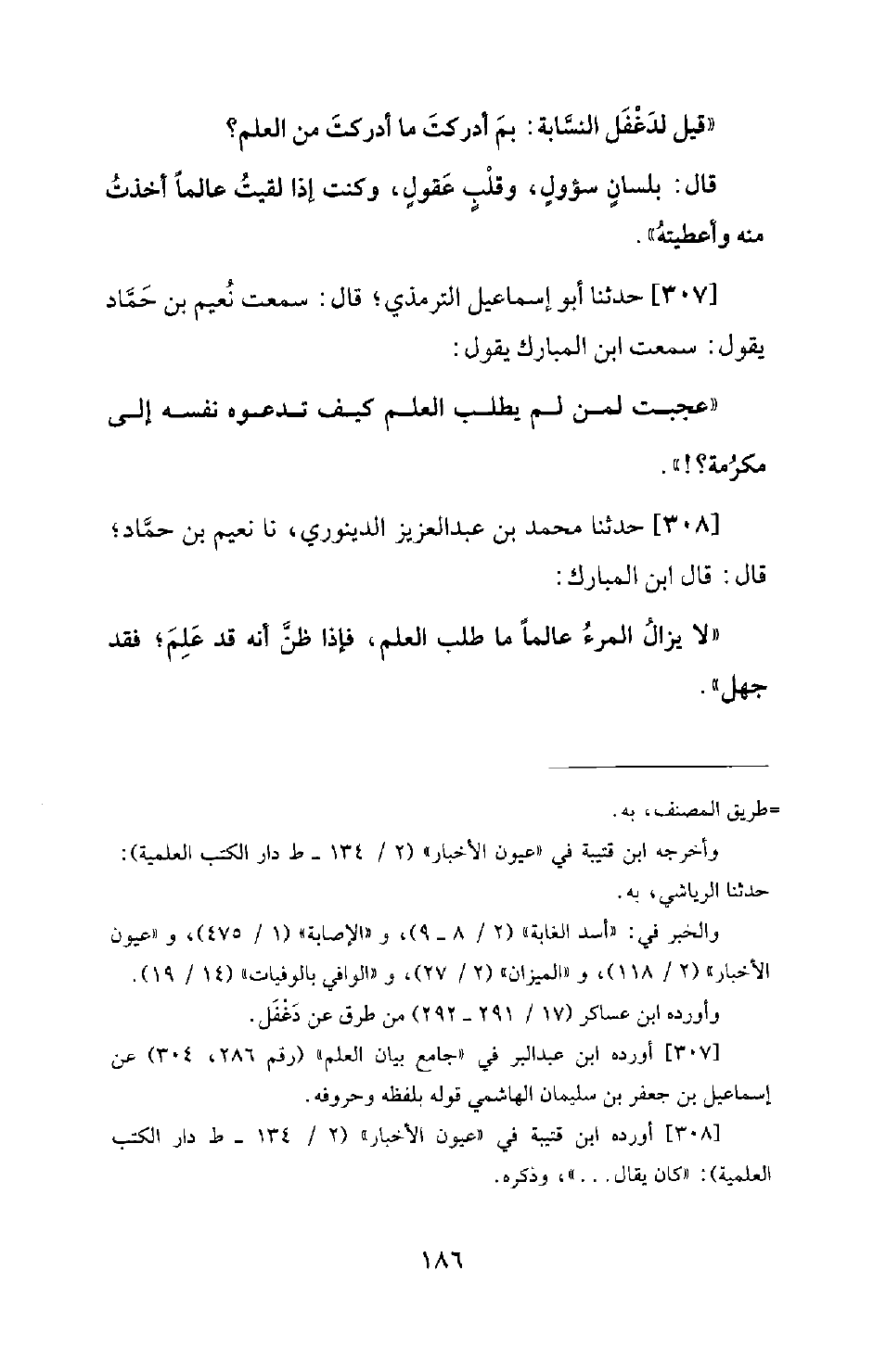 307 - حَدَّثَنَا أَبُو إِسْمَاعِيلَ التِّرْمِذِيُّ، قَالَ: سَمِعْتُ نُعَيْمَ بْنَ حَمَّادٍ يَقُولُ: سَمِعْتُ ابْنَ الْمُبَارَكِ يَقُولُ: عَجِبْتُ لِمَنْ لَمْ يَطْلُبِ الْعِلْمَ كَيْفَ تَدْعُوهُ نَفْسُهُ إِلَى مَكْرُمَةٍ؟ !