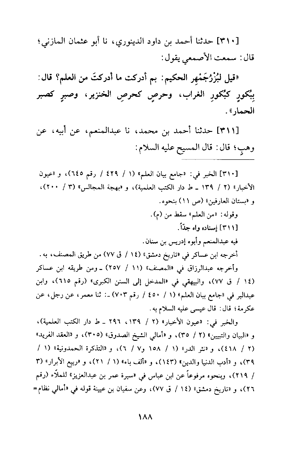 310 - حَدَّثَنَا أَحْمَدُ بْنُ دَاوُدَ الدَّيْنَوَرِيُّ، نَا أَبُو عُثْمَانَ الْمَازِنِيُّ؛ قَالَ: سَمِعْتُ الْأَصْمَعِيَّ يَقُولُ: قِيلَ لِبُزْرُجَمْهِرَ الْحَكِيمِ: بِمَ أَدْرَكْتَ مَا أَدْرَكْتَ مِنَ الْعِلْمِ؟ قَالَ: بِبُكُورٍ كَبُكُورِ الْغُرَابِ، وَحِرْصٍ كَحِرْصِ الْخِنْزِيرِ، وَصَبْرٍ كَصَبْرِ الْحِمَارِ.
