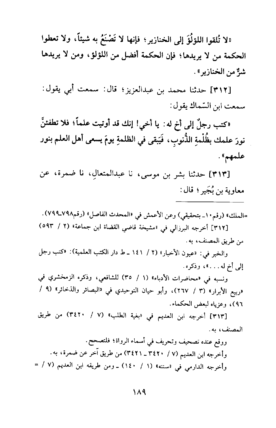 312 - حَدَّثَنَا مُحَمَّدُ بْنُ عَبْدِ الْعَزِيزِ؛ قَالَ: سَمِعْتُ أَبِي يَقُولُ: سَمِعْتُ ابْنَ السَّمَّاكِ يَقُولُ: كَتَبَ رَجُلٌ إِلَى أَخٍ لَهُ: يَا أَخِي! إِنَّكَ قَدْ أُوتِيتَ عِلْمًا؛ فَلَا تُطْفِئَنَّ نُورَ عِلْمِكَ بِظُلْمَةِ الذُّنوبِ، فَتبقى فِي الظُّلْمَةِ يَوْمَ يَسْعَى أَهْلُ الْعِلْمِ بِنُورِ عِلْمِهِمْ.