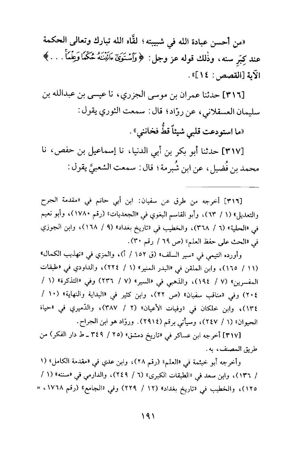 316 - حدثنا عمران بن موسى الجزري، نا عيسى بن عبد الله بن سليمان العسقلاني، عن روّاد؛ قال: سمعت الثوري يقول: ما استودعت قلبي شَيْئًا قطٌّ فخانني.
