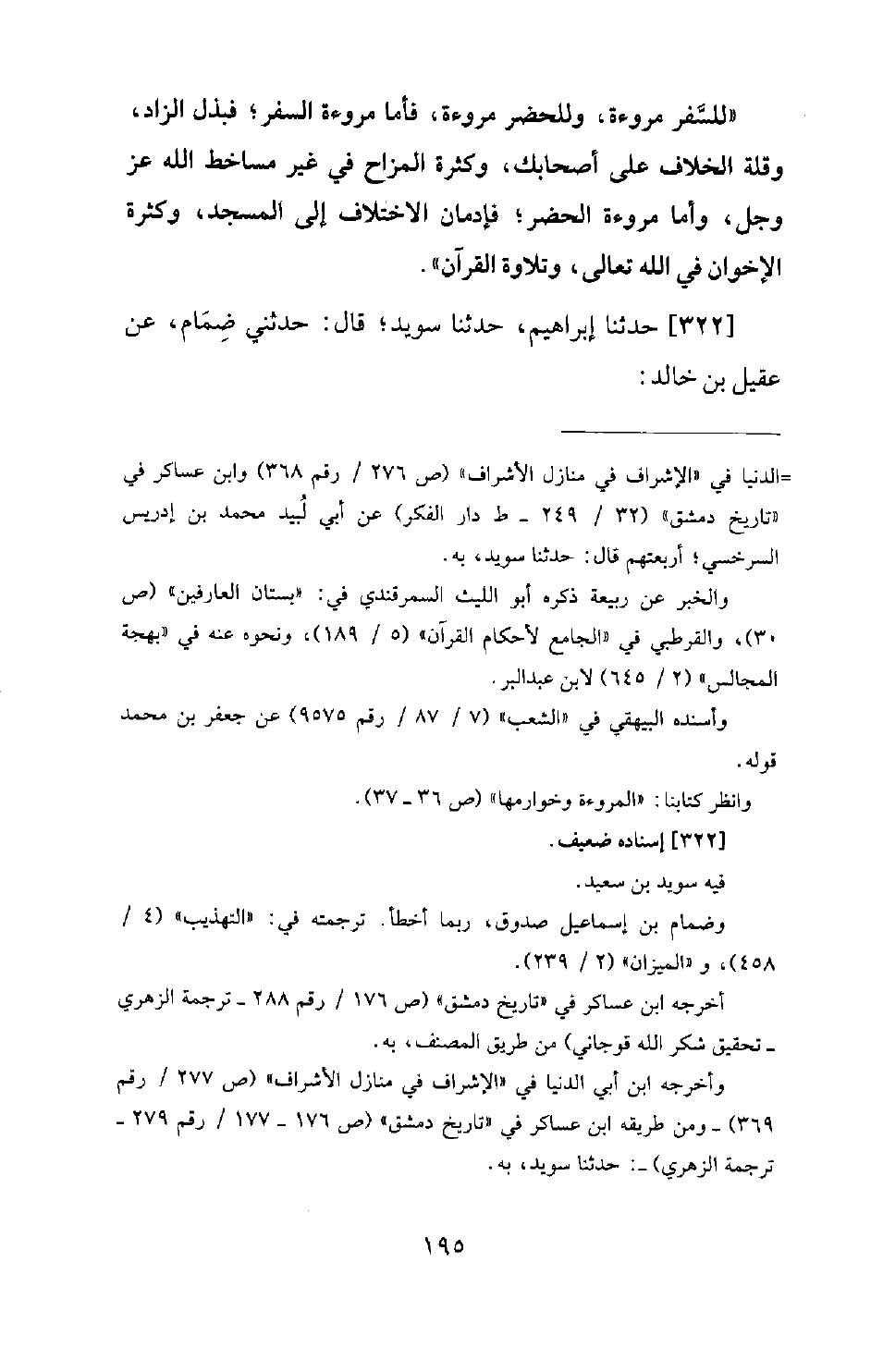322 - حَدَّثَنَا إِبْرَاهِيمُ، حَدَّثَنَا سُوَيْدُ؛ قَالَ: حَدَّثَنِي ضِمَامٌ، عَنْ عُقَيْلِ بْنِ خَالِدٍ -[196]- أَنَّهُ أَخْبَرَهُ: أَنَّ الزُّهْرِيَّ كَانَ يَخْرُجُ إِلَى الْأَعْرَابِ يُفَقِّهُهُمْ وَيُعْطِيهِمْ. قَالَ عُقَيْلُ: فَجَاءَهُ أَعْرَابِيٌّ وَقَدْ نَفَدَ مَا فِي يَدِهِ؛ فَمَدَّ الزُّهْرِيُّ يَدَهُ إِلَى عِمَامَتِي؛ فَأَخَذَهَا مِنْ رَأْسِي، فَأَعْطَاهَا الرَّجُلَ، وَقَالَ: يَا عُقَيْلُ! أُعْطِيكَ خَيْرًا مِنْهَا