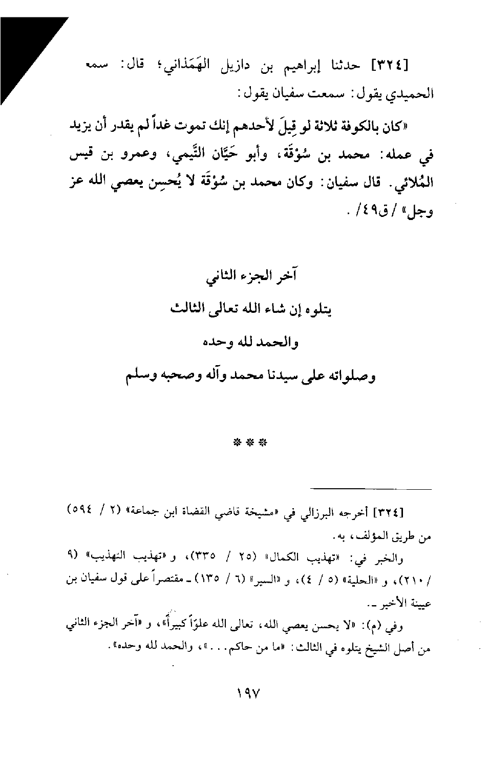 324 - حَدَّثَنَا إِبْرَاهِيمُ بْنُ دَازِيلَ الْهَمَذَانِيُّ؛ قَالَ: سَمِعْتُ الْحُمَيْدِيَّ يَقُولُ: سَمِعْتُ سُفْيَانَ يَقُولُ: كَانَ بِالْكُوفَةِ ثَلَاثَةٌ لَوْ قِيَل لِأَحَدِهِمْ إِنَّكَ تَمُوتُ غَدًا لَمْ يَقْدِرْ أَنْ يَزِيدَ فِي عَمَلِهِ: مُحَمَّدُ بْنُ سُوْقَة، وَأَبُو حَيَّانَ التَّيْمِيُّ، وعمرو بْنُ قَيْسٍ الْمُلَائِيُّ. قَالَ سُفْيَانُ: وَكَانَ مُحَمَّدُ بْنُ سُوْقَة لَا يُحْسِنُ يَعْصِي اللهَ عَزَّ وَجَلَّ.