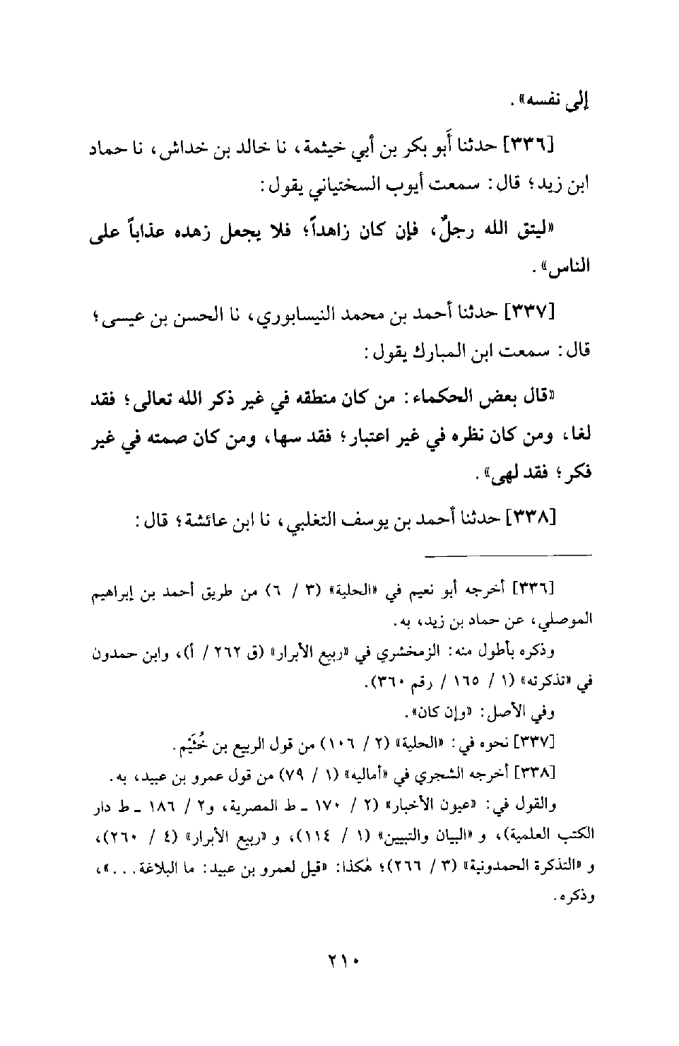 336 - حَدَّثَنَا أَبُو بَكْرِ بْنُ أَبِي خَيْثَمَةَ، نَا خَالِدُ بْنُ خِدَاشٍ، نَا حَمَّادُ بْنُ زَيْدٍ؛ قَالَ: سَمِعْتُ أَيُّوبَ السَّخْتِيَانِيَّ يَقُولُ: لِيَتَّقِ اللهَ رَجُلٌ، فَإِنْ كَانَ زَاهِدًا؛ فَلَا يَجْعَلْ زُهْدَهُ عَذَابًا عَلَى النَّاسِ.