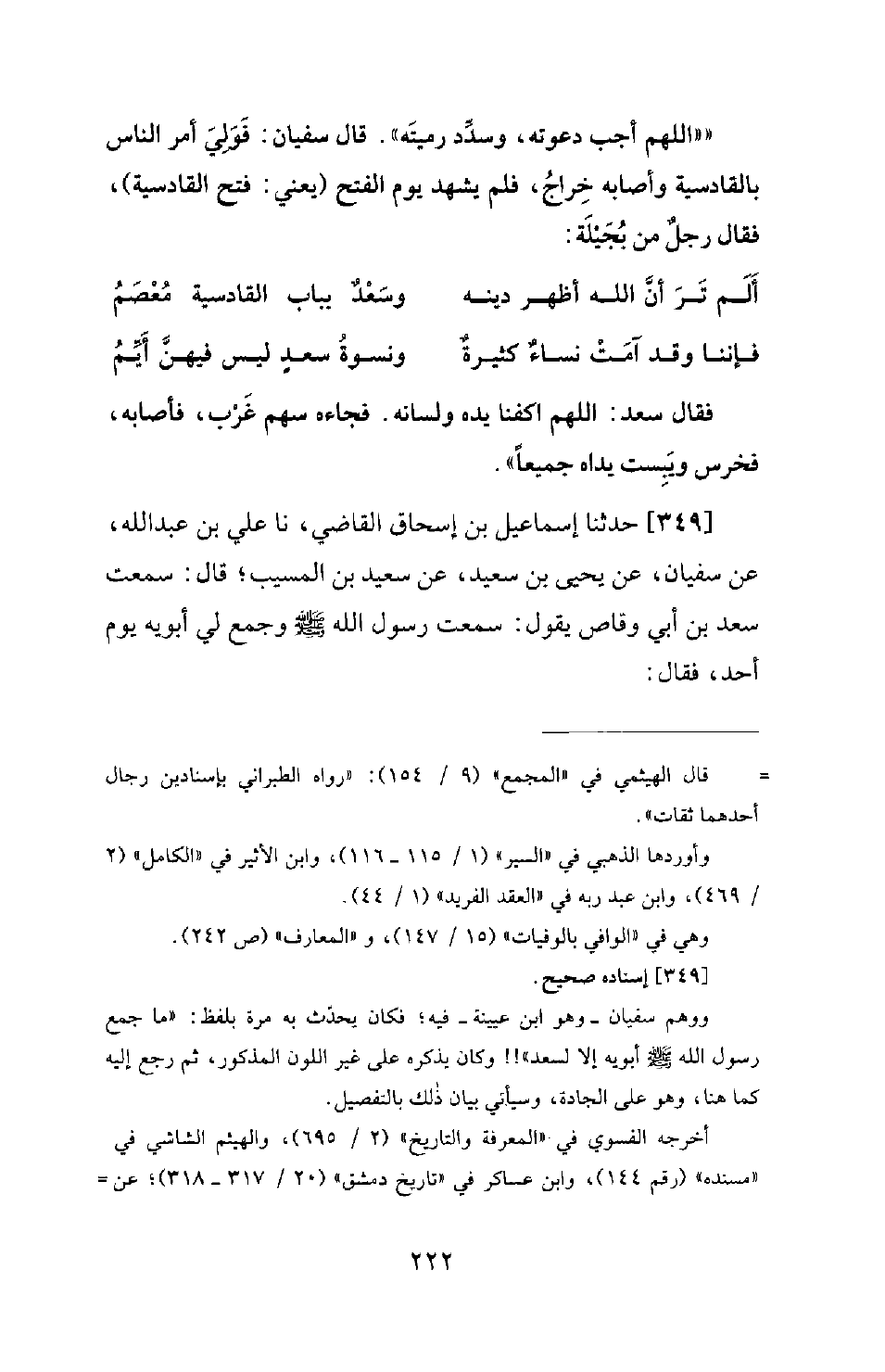 349 - حَدَّثَنَا إِسْمَاعِيلُ بْنُ إِسْحَاقَ الْقَاضِي، نَا عَلِيُّ بْنُ عَبْدِ اللهِ، عَنْ سُفْيَانَ، عَنْ يَحْيَى بْنِ سَعِيدٍ، عَنْ سَعِيدِ بْنِ الْمُسَيِّبِ؛ قَالَ: سَمِعْتُ سَعْدَ بْنَ أَبِي وَقَّاصٍ يَقُولُ: سَمِعْتُ رَسُولَ اللهِ صَلَّى اللَّهُ عَلَيْهِ وَسَلَّمَ وَجَمَعَ لِي أَبَوَيْهِ يَوْمَ أُحُدٍ؛ فَقَالَ -[229]-: «ارْمِ فِدَاكَ أَبِي وَأُمِّي!» . قَالَ سُفْيَانُ: وَحَدَّثَنِي الْمَسْعُودِيُّ عَنِ الْقَاسِمِ؛ قَالَ: أَوَّلُ مَنْ رَمَى بِسَهْمٍ فِي سَبِيلِ اللهِ عَزَّ وَجَلَّ سَعْدُ بْنُ أَبِي وَقَّاصٍ