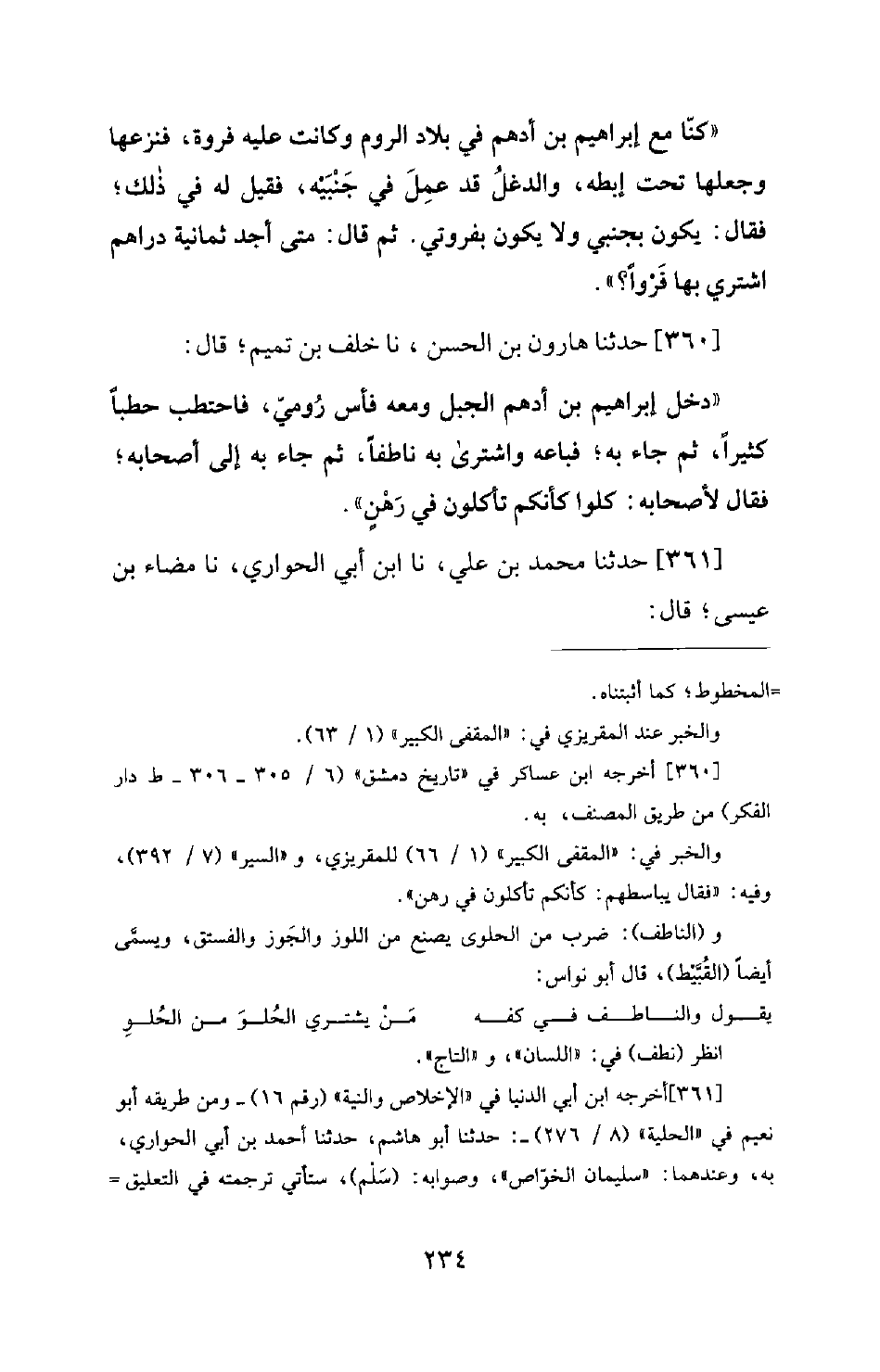 360 - حَدَّثَنَا هَارُونُ بْنُ الْحَسَنِ، نَا خَلَفُ بْنُ تَمِيمٍ؛ قَالَ: دَخَلَ إِبْرَاهِيمُ بْنُ أَدْهَمَ الْجَبَلَ وَمَعَهُ فأس رُومِيٌّ، فَاحْتَطَبَ حَطَبًا كَثِيرًا، ثُمَّ جَاءَ بِهِ؛ فَبَاعَهُ وَاشْتَرَى بِهِ نَاطِفًا، ثُمَّ جَاءَ بِهِ إِلَى أَصْحَابِهِ؛ فَقَالَ لِأَصْحَابِهِ: كُلُوا كَأَنَّكُمْ تَأْكُلُونَ فِي رَهْنٍ.