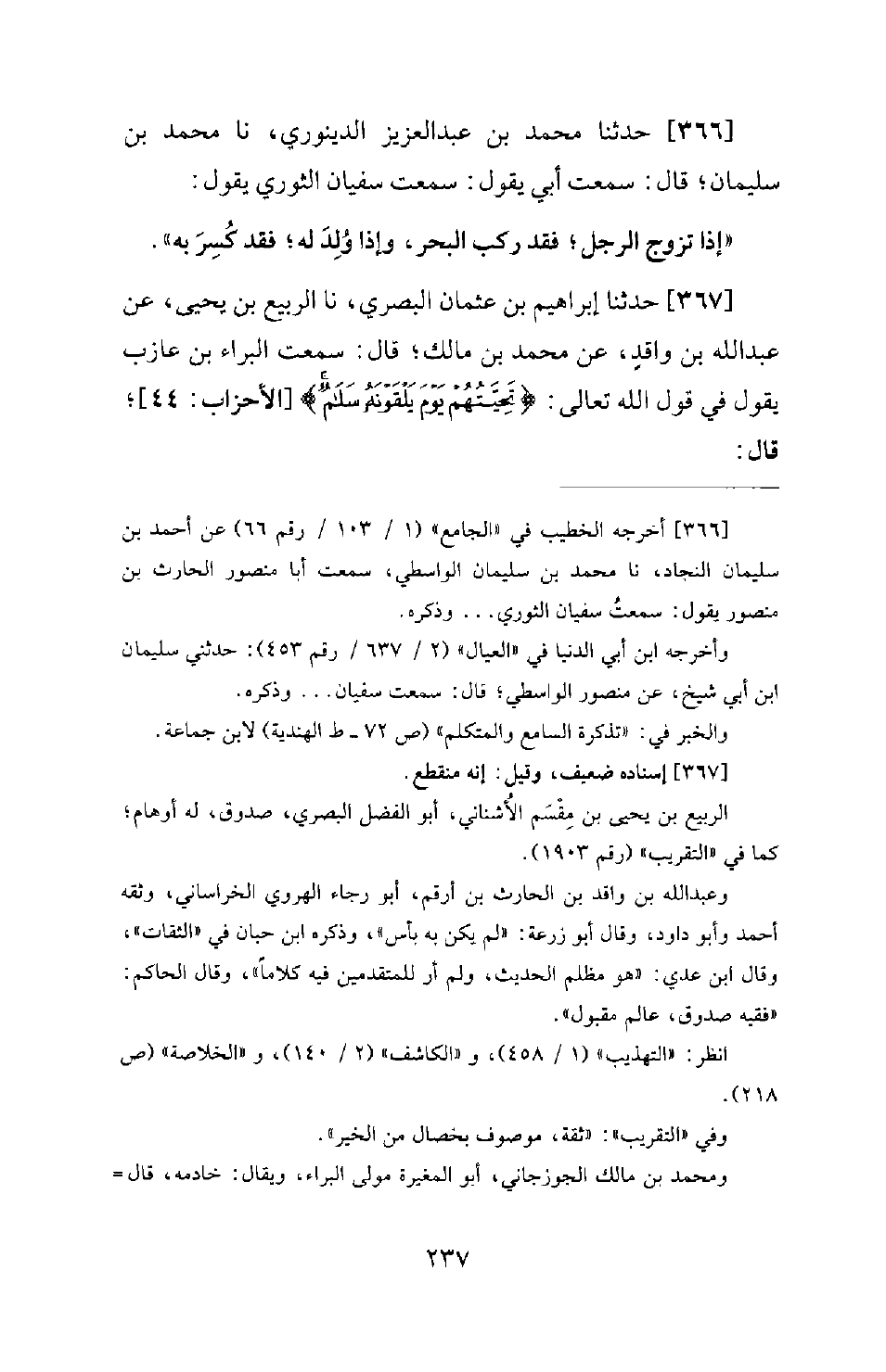 366 - حَدَّثَنَا مُحَمَّدُ بْنُ عَبْدِ الْعَزِيزِ الدَّيْنَوَرِيُّ، نَا مُحَمَّدُ بْنُ سُلَيْمَانَ؛ قَالَ: سَمِعْتُ أَبِي يَقُولُ: سَمِعْتُ سُفْيَانَ الثَّوْرِيَّ يَقُولُ: إِذَا تَزَوَّجَ الرَّجُلُ؛ فَقَدْ رَكِبَ الْبَحْرَ، وَإِذَا وُلِدَ لَهُ؛ فَقَدْ كُسِرَ بِهِ.