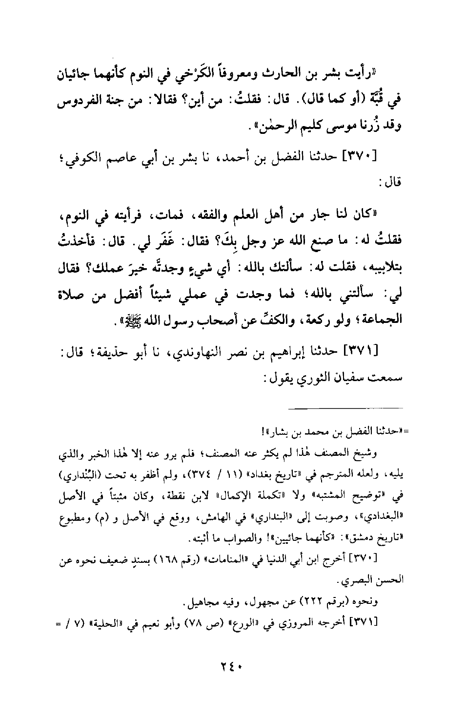 370 - حَدَّثَنَا الْفَضْلُ بْنُ أَحْمَدَ، نَا بِشْرُ بْنُ أَبِي عَاصِمٍ الْكُوفِيُّ؛ قَالَ: كَانَ لَنَا جَارٌ مِنْ أَهْلِ الْعِلْمِ وَالْفِقْهِ، فَمَاتَ، فَرَأَيْتُهُ فِي النَّوْمِ، فَقُلْتُ لَهُ: مَا صَنَعَ اللهُ عَزَّ وَجَلَّ بِكَ؟ فَقَالَ: غَفَرَ لِي. قَالَ: فَأَخَذْتُ بِتَلَابِيبِهِ، فَقُلْتُ لَهُ: سَأَلْتُكَ بِاللهِ! أَيُّ شَيْءٍ وَجَدْتَهُ خَيْرَ عَمَلِكَ؟ فَقَالَ لِي: سَأَلْتَنِي بِاللهِ! فَمَا وَجَدْتُ فِي عَمَلِي شَيْئًا أَفْضَلَ مِنْ صَلَاةِ الْجَمَاعَةِ؛ وَلَوْ رَكْعَةٌ، وَالْكَفِّ عَنِ أَصْحَابِ رَسُولِ اللهِ صَلَّى اللَّهُ عَلَيْهِ وَسَلَّمَ.