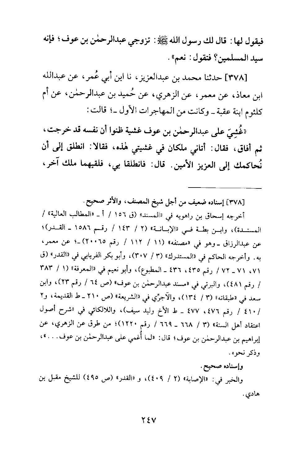 378 - حَدَّثَنَا مُحَمَّدُ بْنُ عَبْدِ الْعَزِيزِ، نَا ابْنُ أَبِي عُمَرَ، عَنْ عَبْدِ اللهِ بْنِ مُعَاذٍ، عَنْ مَعْمَرٍ، عَنِ الزُّهْرِيِّ، عَنْ حُمَيْدِ بْنِ عَبْدِ الرَّحْمَنِ، عَنْ أُمِّ كُلْثُومٍ ابْنَةِ عُقْبَةَ - وَكَانَتْ مِنَ الْمُهَاجِرَاتِ الْأُوَّلِ - قَالَتْ: غُشِيَ عَلَى عَبْدِ الرَّحْمَنِ بْنِ عَوْفٍ غَشْيَةً ظَنُّوا أَنَّ نَفْسَهُ قَدْ خَرَجَتْ، ثُمَّ أَفَاقَ، فَقَالَ: أَتَانِي مَلَكَانِ فِي غَشْيَتِي هَذِهِ، فَقَالَا: انْطَلِقْ إِلَى أَنْ نُحَاكِمَكَ إِلَى الْعَزِيزِ الْأَمِينِ. قَالَ: فَانْطَلَقَا بِي، فَلَقِيَهُمَا مَلَكٌ آخَرُ، -[248]- فَقَالَ: أَيْنَ تُرِيدَانِ بِهِ؟ فَقَالَا: إِلَى الْعَزِيزِ الْعَلِيمِ. فَقَالَ: ارْجِعَا؛ فَإِنَّ هَذَا مِمَّنْ كُتِبَ لَهُ السَّعَادَةُ وَهُوَ فِي بَطْنِ أُمِّهِ، وَسَيُمْتِعُ اللهُ بِهِ رَسُولَهُ صَلَّى اللَّهُ عَلَيْهِ وَسَلَّمَ
