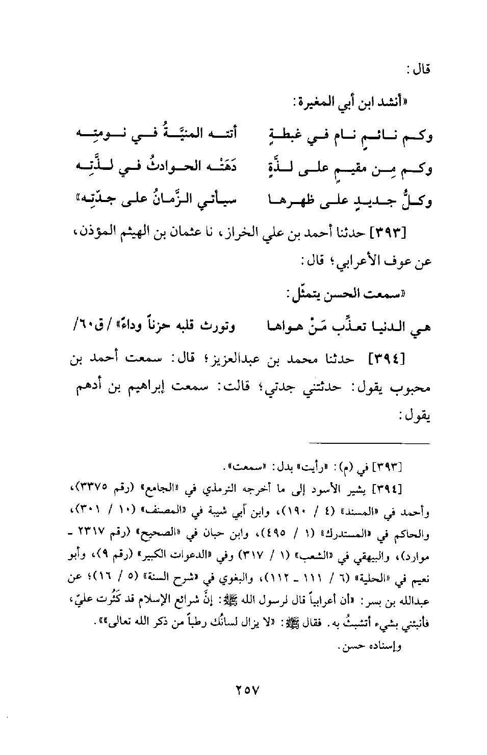 393 - حَدَّثَنَا أَحْمَدُ بْنُ عَلِيٍّ الْخَرَّازُ، نَا عُثْمَانُ بْنُ الْهَيْثَمِ الْمُؤَذِّنُ، عَنْ عَوْفٍ الْأَعْرَابِيِّ؛ قَالَ: سَمِعْتُ الْحَسَنَ يَتَمَثَّلُ: