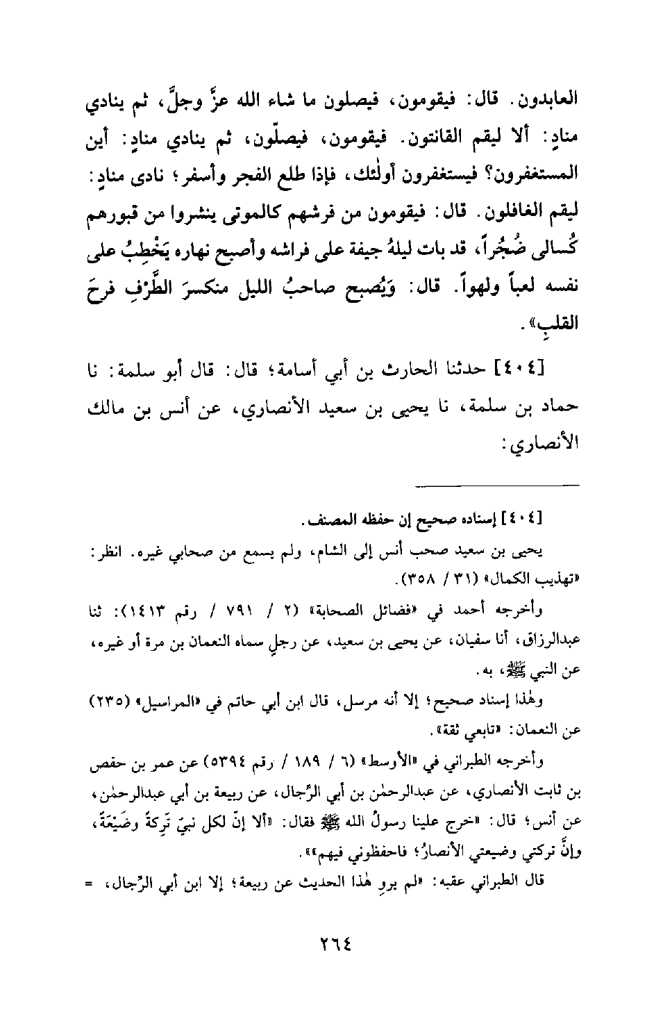 404 - حَدَّثَنَا الْحَارِثُ بْنُ أَبِي أُسَامَةَ؛ قَالَ: قَالَ أَبُو سَلَمَةَ: نَا حَمَّادُ بْنُ سَلَمَةَ، نَا يَحْيَى بْنُ سَعِيدٍ الْأَنْصَارِيُّ، عَنْ أَنَسِ بْنِ مَالِكٍ الْأَنْصَارِيِّ: -[265]- أَنَّ الْأَنْصَارَ اجْتَمَعَتْ ذَاتَ يَوْمٍ، فَدَخَلَ أَبُو بَكْرٍ رَضِيَ اللهُ عَنْهُ عَلَى النَّبِيِّ صَلَّى اللَّهُ عَلَيْهِ وَسَلَّمَ، فَقَالَ: إِنَّ الْأَنْصَارَ قَدِ اجْتَمَعَتْ، فَخَرَجَ رَسُولُ اللهِ صَلَّى اللَّهُ عَلَيْهِ وَسَلَّمَ عَاصِبًا رَأْسَهُ؛ فَحَمِدَ اللهَ وَأَثْنَى عَلَيْهِ، ثُمَّ قَالَ: «إِنَّ لِكُلِّ نَبِيٍّ تَرِكَةً -[266]- وَضَيْعَةً، وَإِنَّ الْأَنْصَارَ كَرِشِي وَضَيْعَتِي، وَإِنَّهُمْ سَيَقِلُّونَ وَيَكْثُرُ النَّاسُ؛ فَاقْبَلُوا مِنْ مُحْسِنِهِمْ، وَتَجَاوَزُوا عَنْ مُسِيئِهِمْ